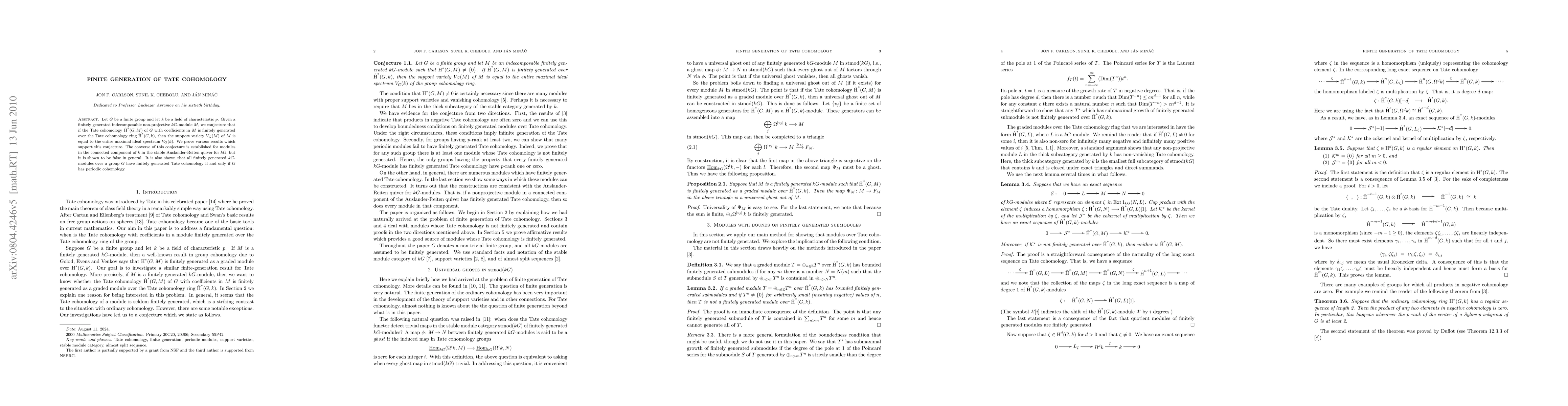 This paper explores the finite generation of Tate cohomology for finite groups and finitely generated kG-modules, proving that if Tate cohomology is finitely generated, the support variety equals the maximal ideal spectrum, and establishing the converse for connected components in the stable Auslander-Reiten quiver. The study concludes that all finitely generated kG-modules have finitely generated Tate cohomology if and only if the group has periodic cohomology.