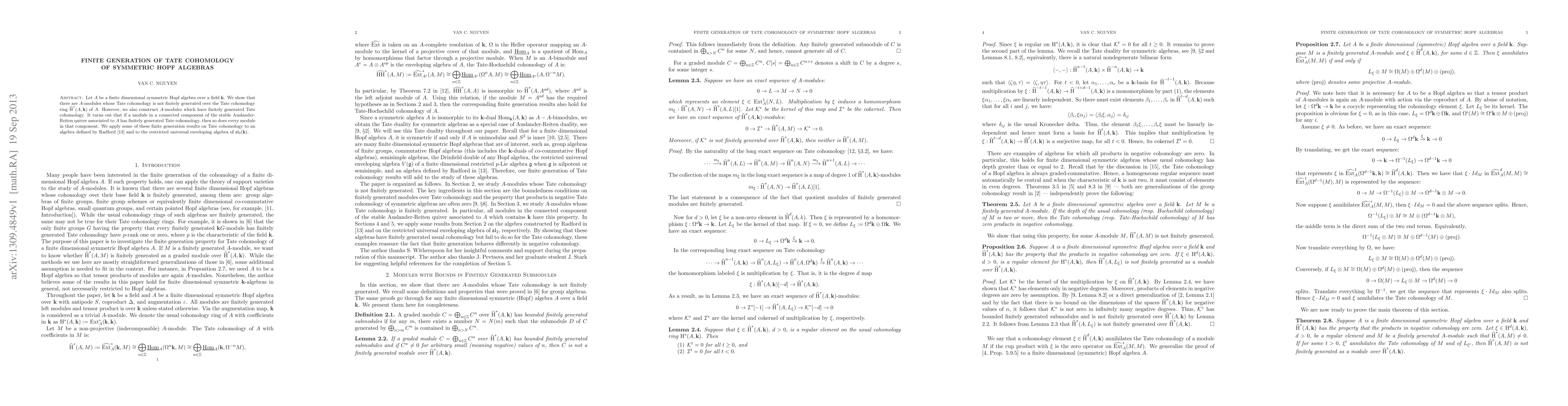 This paper explores the Tate cohomology of finite dimensional symmetric Hopf algebras, demonstrating instances where Tate cohomology is not finitely generated and others where it is. It reveals that within a connected component of the stable Auslander-Reiten quiver, Tate cohomology's finite generation is a shared property among modules. Applications include insights into Radford algebras and the restricted universal enveloping algebra of $sl_2(k)$.