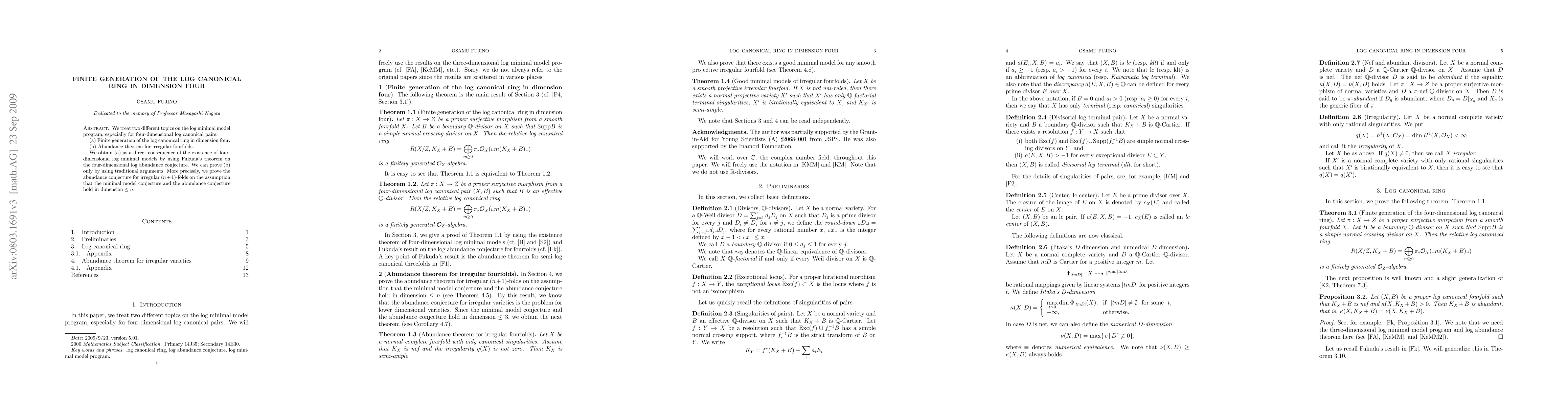 We treat two different topics on the log minimal model program, especially for four-dimensional log canonical pairs. (a) Finite generation of the log canonical ring in dimension four. (b) Abundance theorem for irregular fourfolds. We obtain (a) as a direct consequence of the existence of four-dimensional log minimal models by using Fukuda's theorem on the four-dimensional log abundance conjecture. We can prove (b) only by using traditional arguments. More precisely, we prove the abundance conjecture for irregular $(n+1)$-folds on the assumption that the minimal model conjecture and the abundance conjecture hold in dimension $\leq n$.