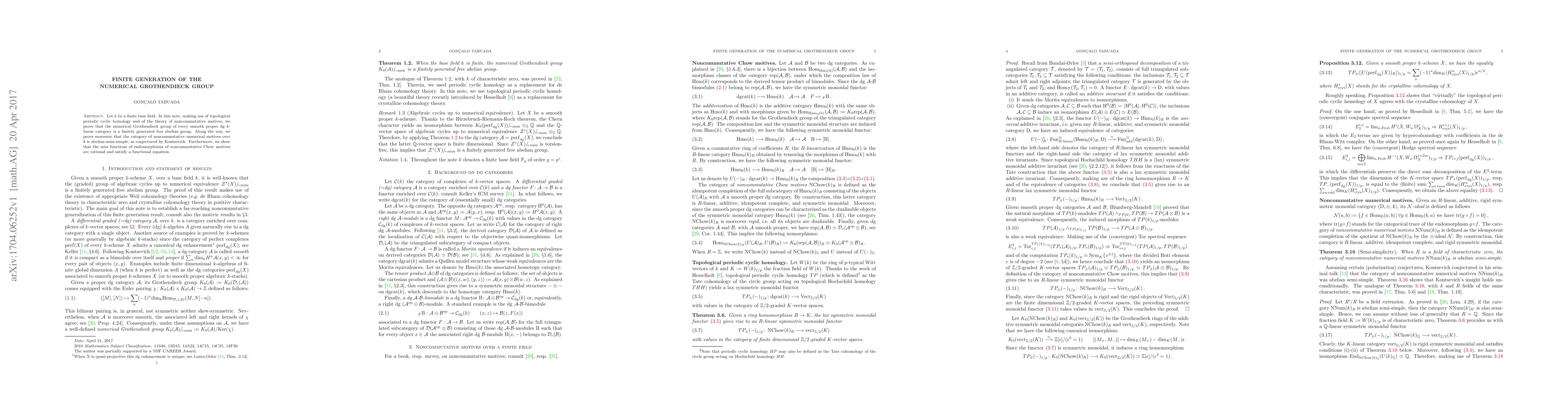 Let k be a finite base field. In this note, making use of topological periodic cyclic homology and of the theory of noncommutative motives, we prove that the numerical Grothendieck group of every smooth proper dg k-linear category is a finitely generated free abelian group. Along the way, we prove moreover that the category of noncommutative numerical motives over k is abelian semi-simple, as conjectured by Kontsevich. Furthermore, we show that the zeta functions of endomorphisms of noncommutative Chow motives are rational and satisfy a functional equation.