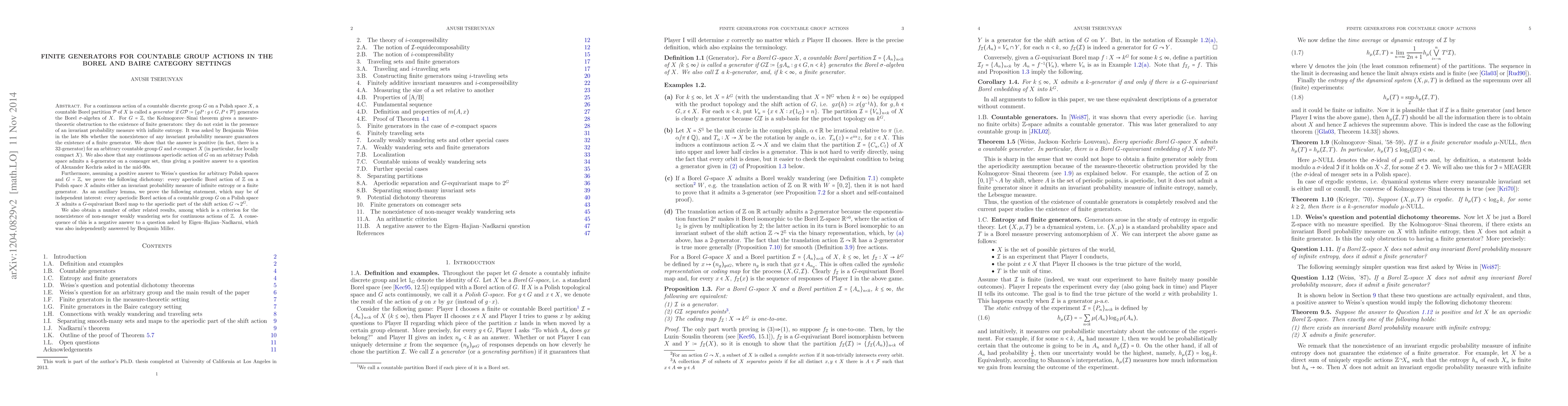 For a continuous action of a countable discrete group $G$ on a Polish space $X$, a countable Borel partition $P$ of $X$ is called a generator if $G \cdot P := \{ gC : g \in G, C \in P \}$ generates the Borel $\sigma$-algebra of $X$. For $G = Z$, the Kolmogorov--Sinai theorem gives a measure-theoretic obstruction to the existence of finite generators: they do not exist in the presence of an invariant probability measure with infinite entropy. It was asked by Benjamin Weiss in the late 80s whether the nonexistence of any invariant probability measure guarantees the existence of a finite generator. We show that the answer is positive (in fact, there is a 32-generator) for an arbitrary countable group $G$ and $\sigma$-compact $X$ (in particular, for locally compact $X$). We also show that any continuous aperiodic action of $G$ on an arbitrary Polish space admits a 4-generator on a comeager set, thus giving a positive answer to a question of Alexander Kechris asked in the mid-90s. Furthermore, assuming a positive answer to Weiss's question for arbitrary Polish spaces and $G = Z$, we prove the following dichotomy: every aperiodic Borel action of $Z$ on a Polish space $X$ admits either an invariant probability measure of infinite entropy or a finite generator. As an auxiliary lemma, we prove the following statement, which may be of independent interest: every aperiodic Borel action of a countable group $G$ on a Polish space $X$ admits a $G$-equivariant Borel map to the aperiodic part of the shift action of $G$ on $2^G$. We also obtain a number of other related results, among which is a criterion for the nonexistence of non-meager weakly wandering sets for continuous actions of $Z$. A consequence of this is a negative answer to a question asked by Eigen--Hajian--Nadkarni, which was also independently answered by Benjamin Miller.