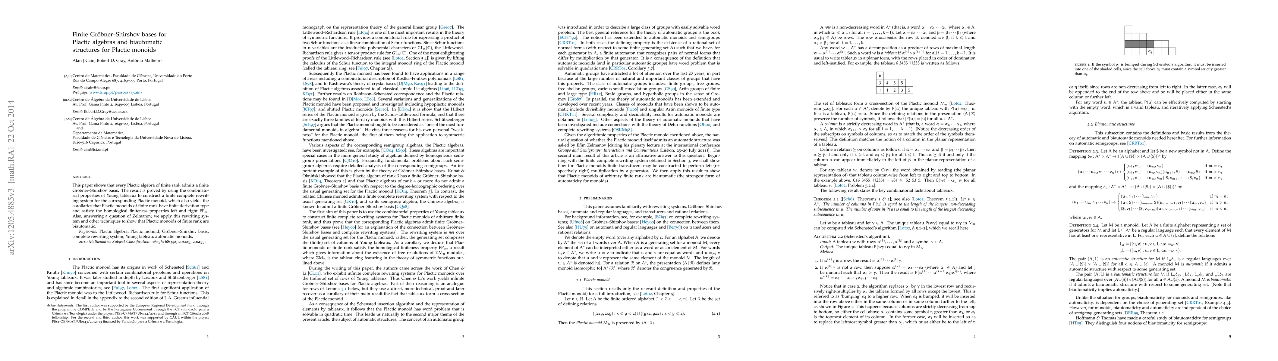 This paper establishes that finite-rank Plactic algebras possess finite Gröbner-Shirshov bases, leveraging Young tableaux properties to construct a complete rewriting system for Plactic monoids, leading to the conclusion that these monoids exhibit finite derivation type and satisfy $FP_\infty$ homological properties, and are also shown to be biautomatic.