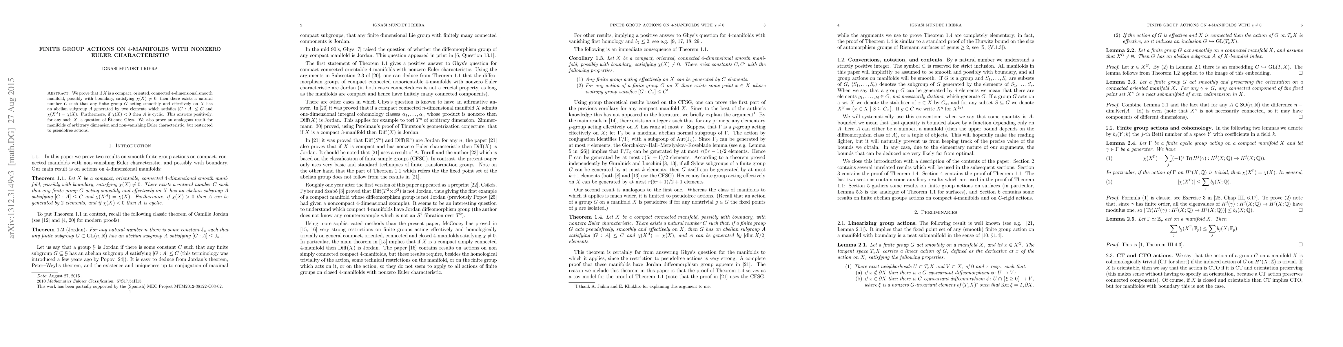 The paper proves the existence of an abelian subgroup in any finite group acting smoothly and effectively on a compact, oriented, connected 4-manifold with nonzero Euler characteristic, such that the subgroup index is bounded, preserves the Euler characteristic, and is cyclic if the Euler characteristic is negative. This resolves a conjecture of Ghys and extends the result to arbitrary dimensions under pseudofree actions.