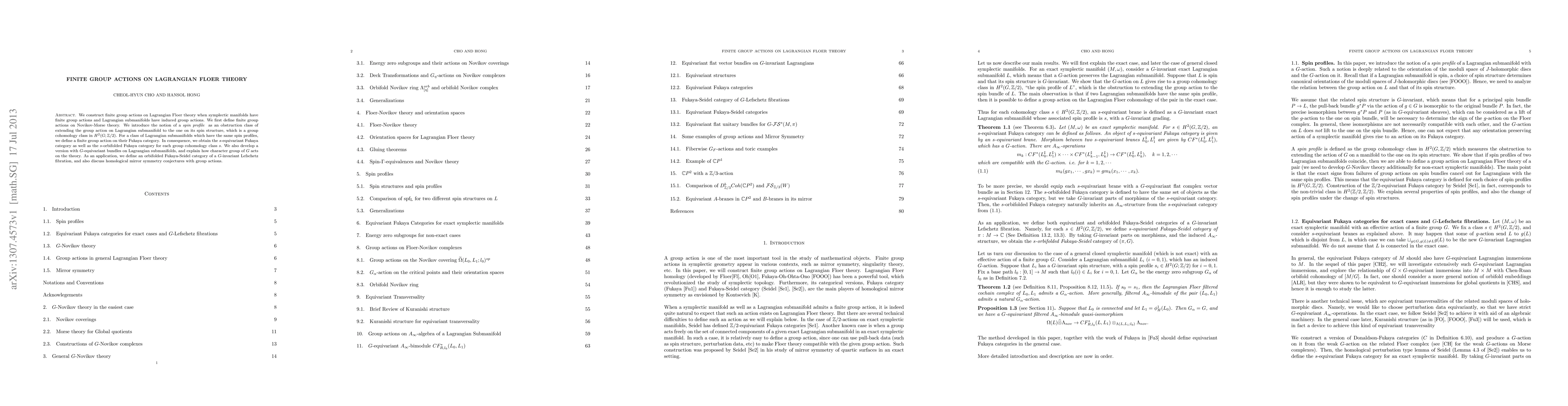 The paper constructs finite group actions on Lagrangian Floer theory by defining group actions on Novikov-Morse theory and introducing the concept of a 'spin profile' as an obstruction class in $H^2(G;\Z/2)$ for extending group actions on Lagrangian submanifolds to their spin structures.