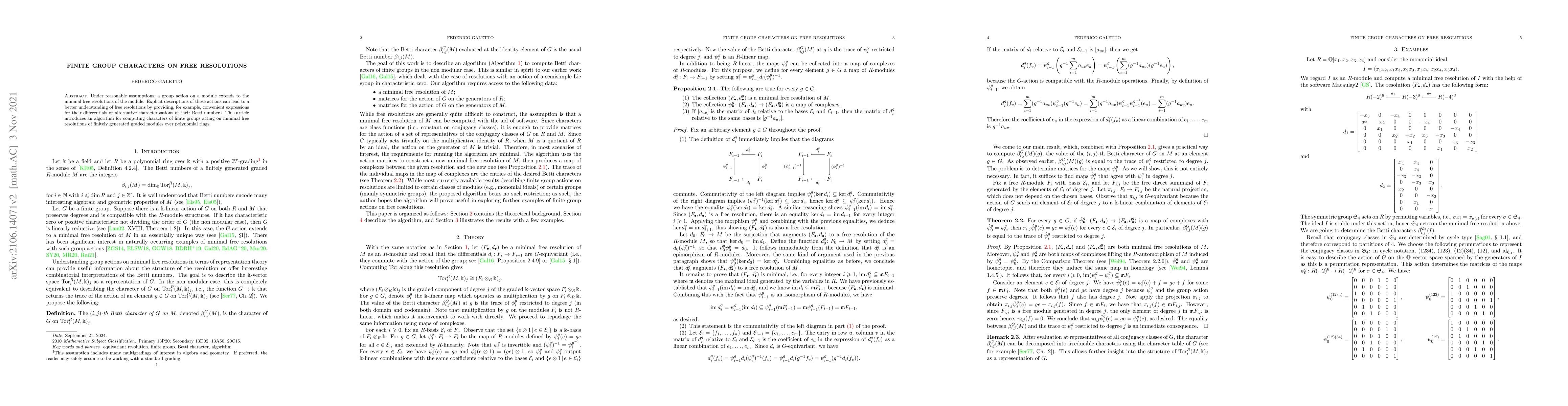This paper develops an algorithm to compute characters of finite group actions on the minimal free resolutions of finitely generated graded modules over polynomial rings, aiming to enhance understanding through explicit action descriptions and alternative characterizations of Betti numbers.