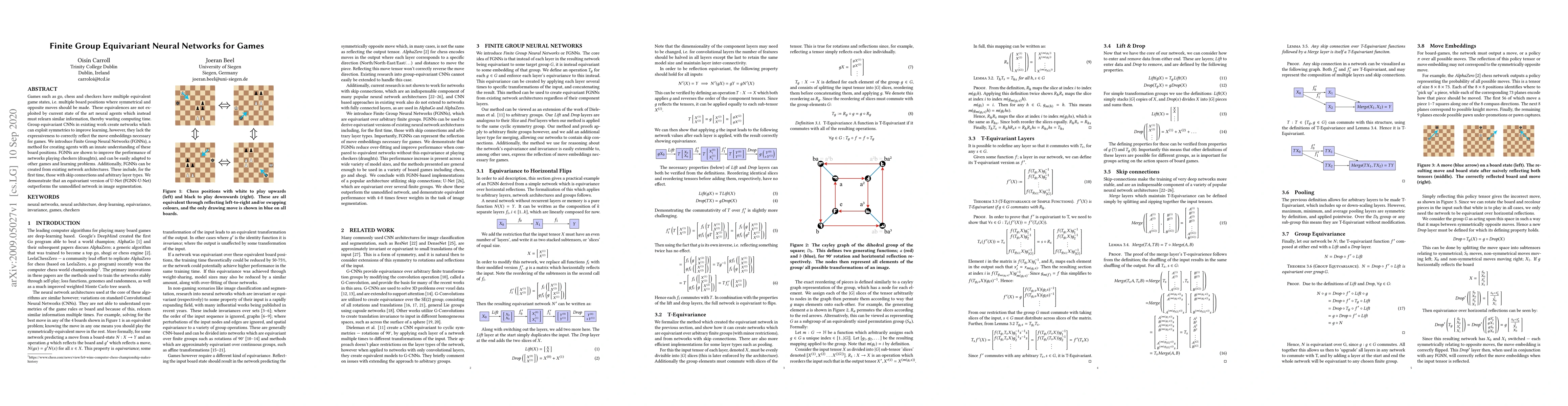 Games such as go, chess and checkers have multiple equivalent game states, i.e. multiple board positions where symmetrical and opposite moves should be made. These equivalences are not exploited by current state of the art neural agents which instead must relearn similar information, thereby wasting computing time. Group equivariant CNNs in existing work create networks which can exploit symmetries to improve learning, however, they lack the expressiveness to correctly reflect the move embeddings necessary for games. We introduce Finite Group Neural Networks (FGNNs), a method for creating agents with an innate understanding of these board positions. FGNNs are shown to improve the performance of networks playing checkers (draughts), and can be easily adapted to other games and learning problems. Additionally, FGNNs can be created from existing network architectures. These include, for the first time, those with skip connections and arbitrary layer types. We demonstrate that an equivariant version of U-Net (FGNN-U-Net) outperforms the unmodified network in image segmentation.