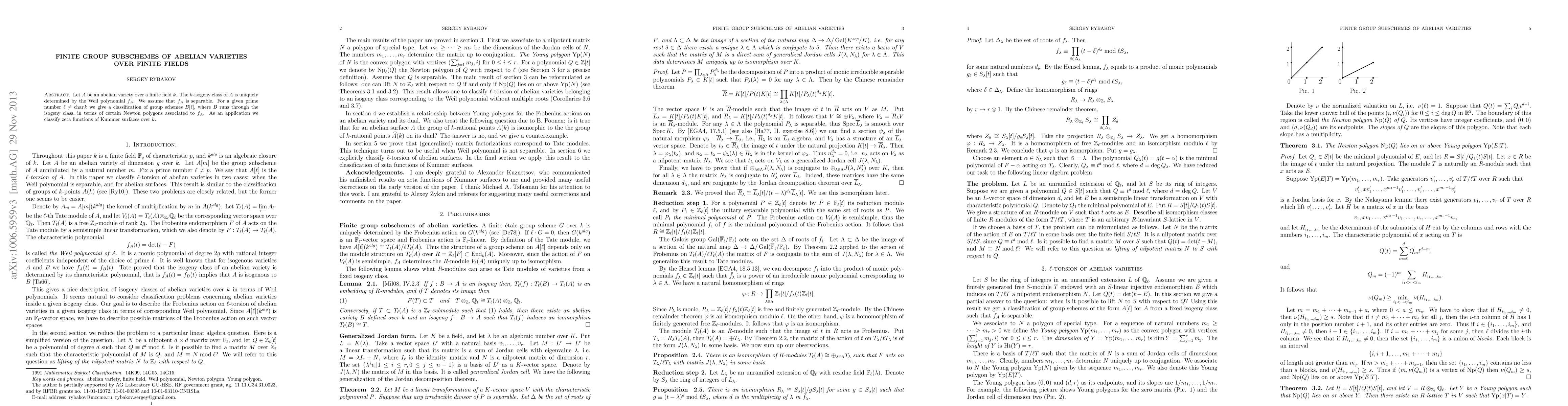 Let $A$ be an abelian variety over a finite field $k$. The $k$-isogeny class of $A$ is uniquely determined by the Weil polynomial $f_A$. We assume that $f_A$ is separable. For a given prime number $\ell\neq\mathrm{char}\, k$ we give a classification of group schemes $B[\ell]$, where $B$ runs through the isogeny class, in terms of certain Newton polygons associated to $f_A$. As an application we classify zeta functions of Kummer surfaces over $k$.