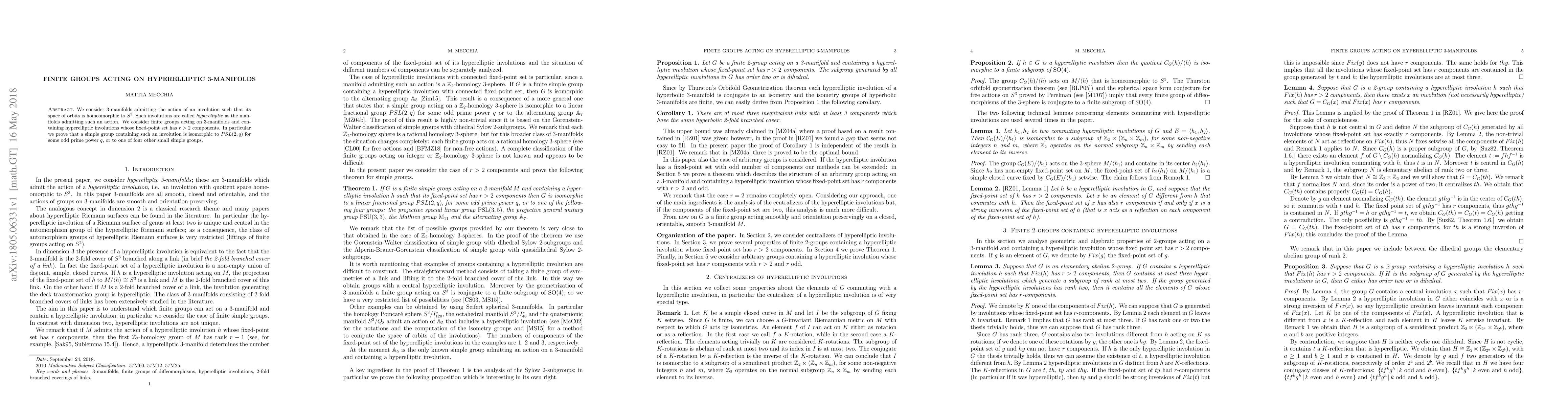 This paper investigates finite groups acting on hyperelliptic 3-manifolds, focusing on those containing hyperelliptic involutions with more than two fixed-point components. The authors prove that any simple group with such an involution is isomorphic to $PSL(2,q)$ for some odd prime power $q$, or one of four other small simple groups.