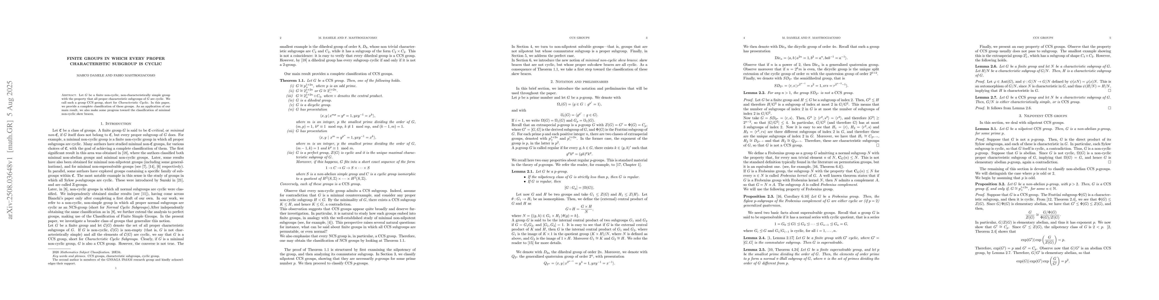 Let $G$ be a finite non-cyclic, non-characteristically simple group with the property that all proper characteristic subgroups of $G$ are cyclic. We call such a group $\mathrm{CCS}$ group, short for \emph{Characteristic Cyclic}. In this paper, we provide a complete classification of these groups. As an application of our main result, we also make some progress toward the classification of minimal non-cyclic skew braces.
