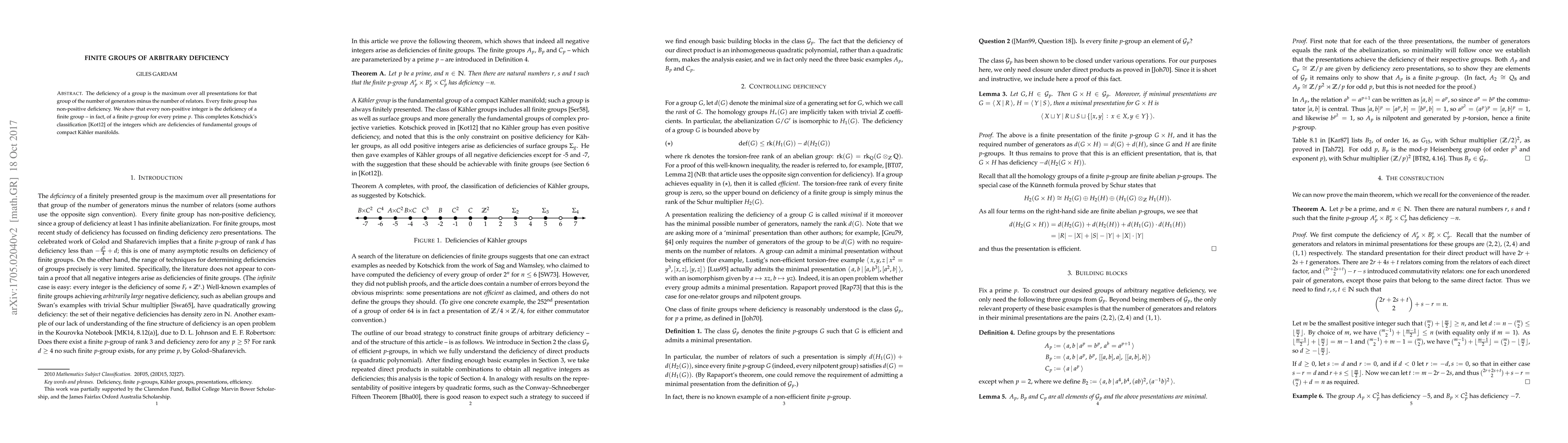 The deficiency of a group is the maximum over all presentations for that group of the number of generators minus the number of relators. Every finite group has non-positive deficiency. We show that every non-positive integer is the deficiency of a finite group -- in fact, of a finite $p$-group for every prime $p$. This completes Kotschick's classification of the integers which are deficiencies of fundamental groups of compact Kaehler manifolds.