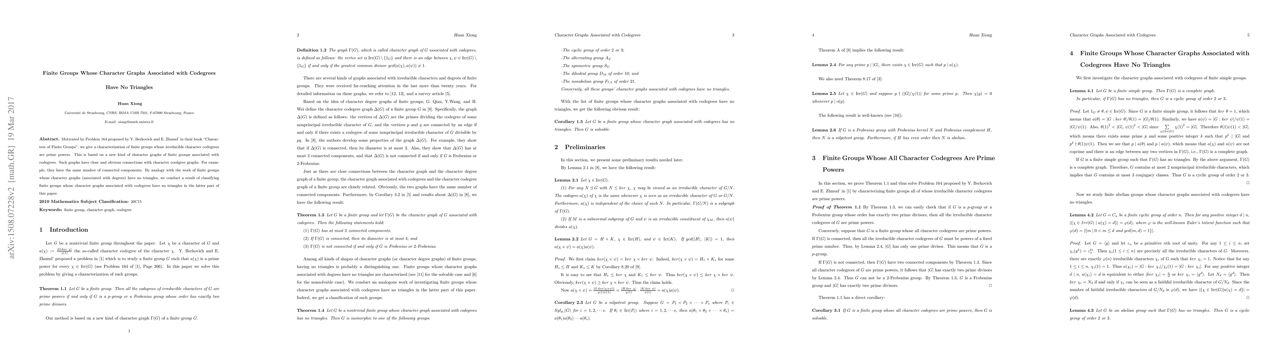 This paper characterizes finite groups where irreducible character codegrees are prime powers, using a new graph type linked to codegrees. It classifies such groups whose associated character graphs have no triangles, extending previous results on character degree graphs.
