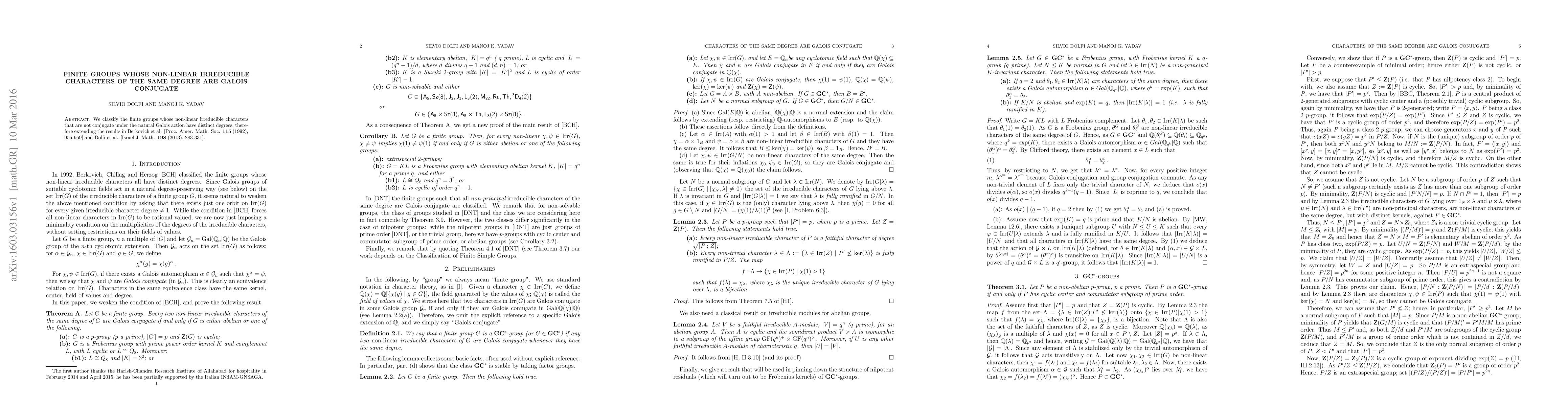 This research classifies finite groups where non-linear irreducible characters of the same degree, not conjugate under Galois action, have distinct degrees. It builds upon previous works by Berkovich et al. and Dolfi et al.