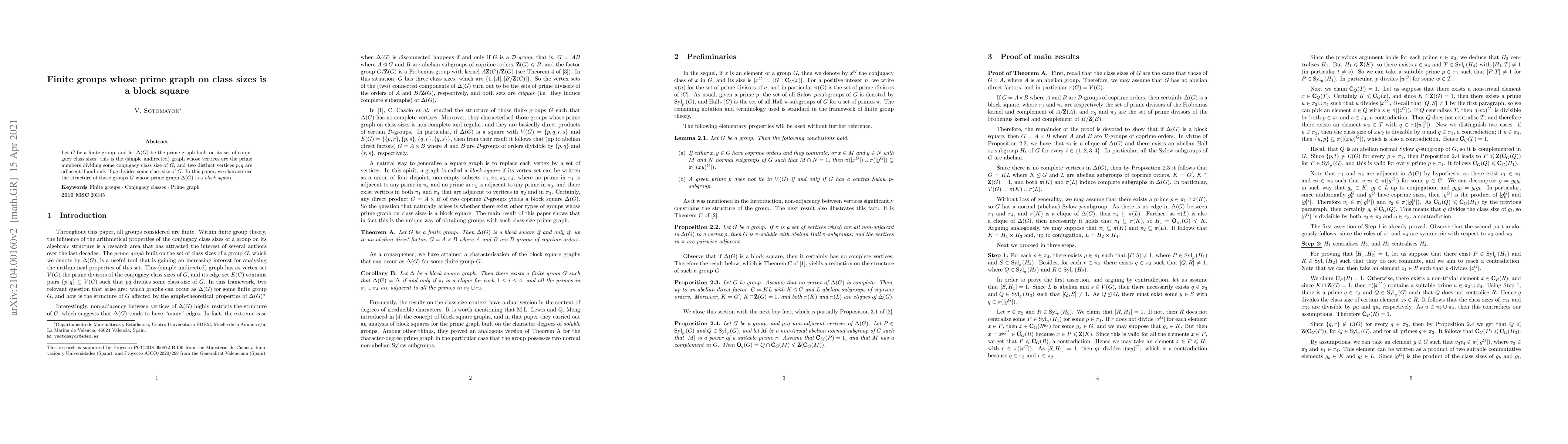 Let $G$ be a finite group, and let $\Delta(G)$ be the prime graph built on its set of conjugacy class sizes: this is the (simple undirected) graph whose vertices are the prime numbers dividing some conjugacy class size of $G$, and two distinct vertices $p, q$ are adjacent if and only if $pq$ divides some class size of $G$. In this paper, we characterise the structure of those groups $G$ whose prime graph $\Delta(G)$ is a block square.