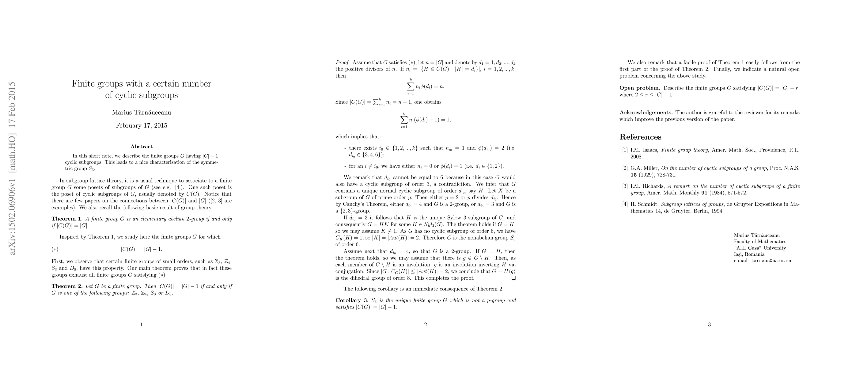 In this short note, we describe the finite groups $G$ having $|G|-1$ cyclic subgroups. This leads to a nice characterization of the symmetric group $S_3$.