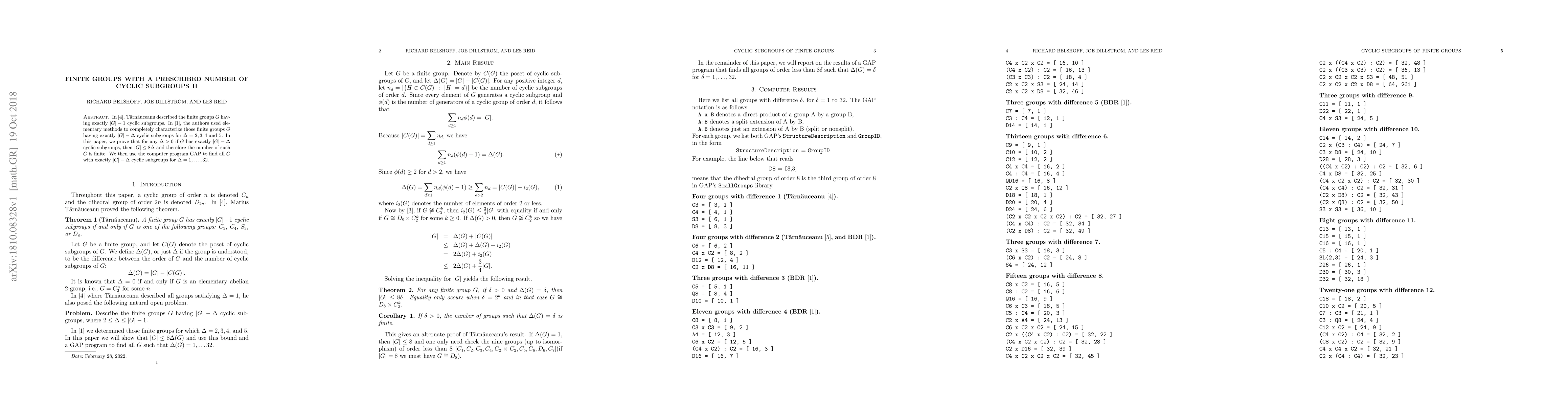 The paper establishes an upper bound on the order of finite groups with a prescribed number of cyclic subgroups, demonstrating that such groups are finite in number and providing a complete enumeration for small values of δ.