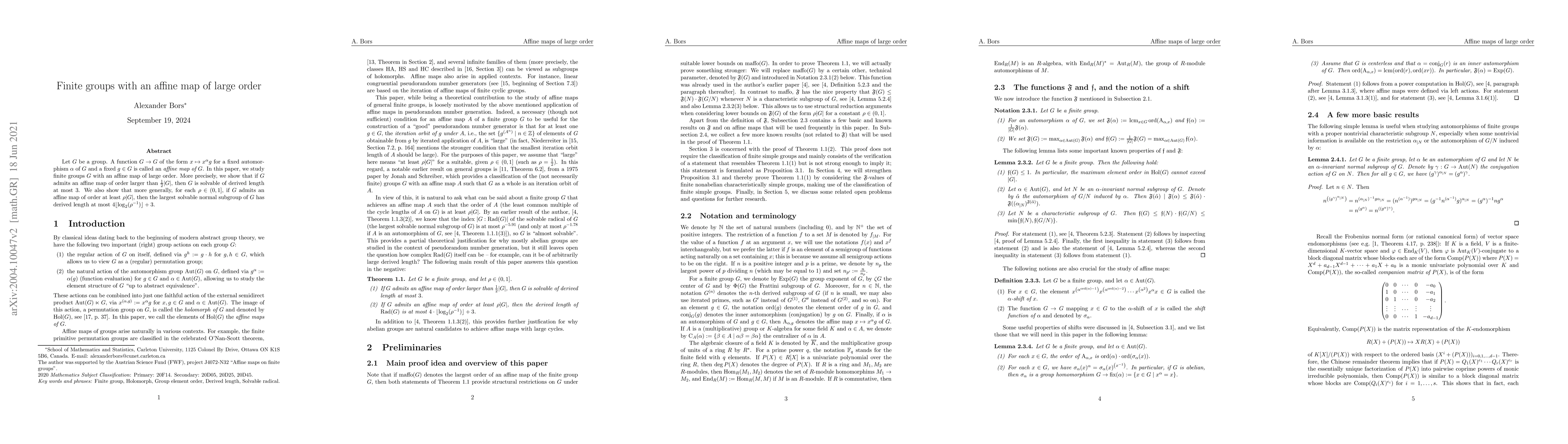 Let $G$ be a group. A function $G\rightarrow G$ of the form $x\mapsto x^{\alpha}g$ for a fixed automorphism $\alpha$ of $G$ and a fixed $g\in G$ is called an affine map of $G$. In this paper, we study finite groups $G$ with an affine map of large order. More precisely, we show that if $G$ admits an affine map of order larger than $\frac{1}{2}|G|$, then $G$ is solvable of derived length at most $3$. We also show that more generally, for each $\rho\in\left(0,1\right]$, if $G$ admits an affine map of order at least $\rho|G|$, then the largest solvable normal subgroup of $G$ has derived length at most $4\lfloor\log_2(\rho^{-1})\rfloor+3$.