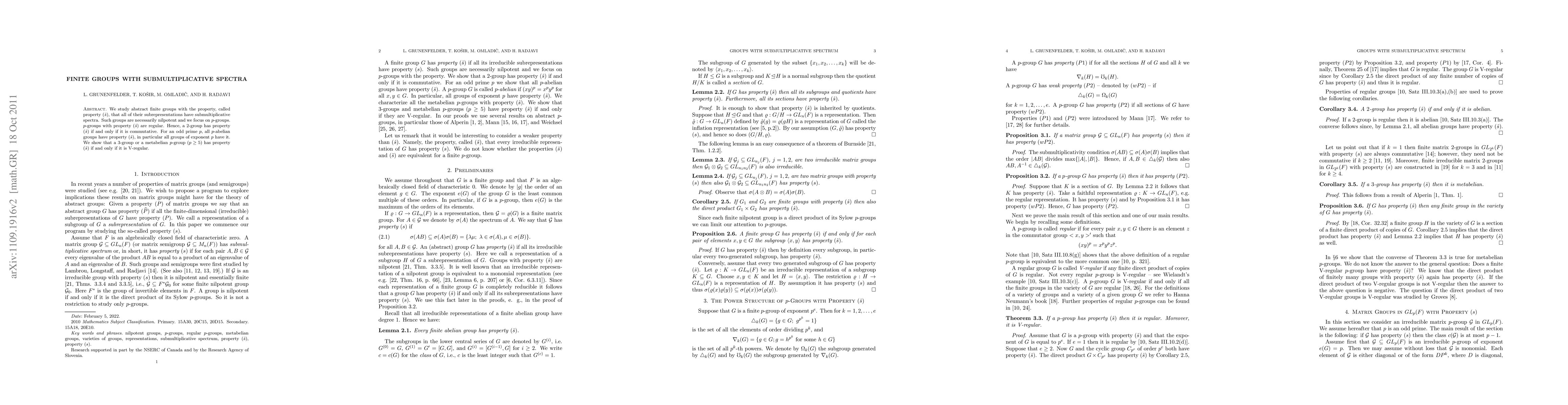 We study abstract finite groups with the property, called property $\hat{s}$, that all of their subrepresentations have submultiplicative spectra. Such groups are necessarily nilpotent and we focus on $p$-groups. $p$-groups with property $\hat{s}$ are regular. Hence, a 2-group has property $\hat{s}$ if and only if it is commutative. For an odd prime $p$, all $p$-abelian groups have property $\hat{s}$, in particular all groups of exponent $p$ have it. We show that a 3-group or a metabelian $p$-group ($p \ge 5$) has property $\hat{s}$ if and only if it is V-regular.