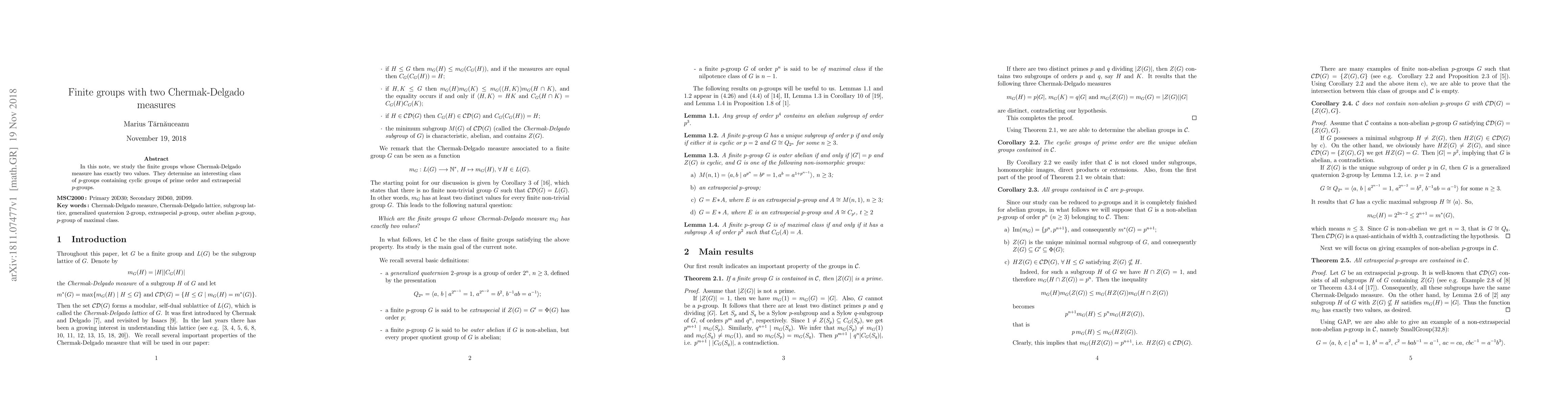 In this note, we study the finite groups whose Chermak-Delgado measure has exactly two values. They determine an interesting class of $p$-groups containing cyclic groups of prime order and extraspecial $p$-groups.