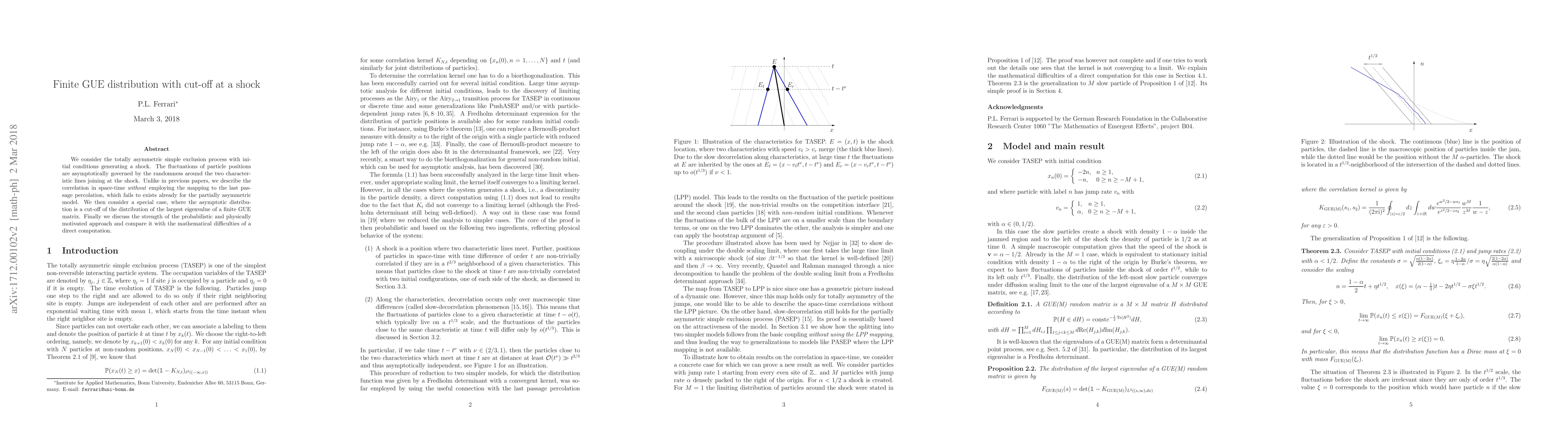 We consider the totally asymmetric simple exclusion process with initial conditions generating a shock. The fluctuations of particle positions are asymptotically governed by the randomness around the two characteristic lines joining at the shock. Unlike in previous papers, we describe the correlation in space-time \emph{without} employing the mapping to the last passage percolation, which fails to exists already for the partially asymmetric model. We then consider a special case, where the asymptotic distribution is a cut-off of the distribution of the largest eigenvalue of a finite GUE matrix. Finally we discuss the strength of the probabilistic and physically motivated approach and compare it with the mathematical difficulties of a direct computation.
