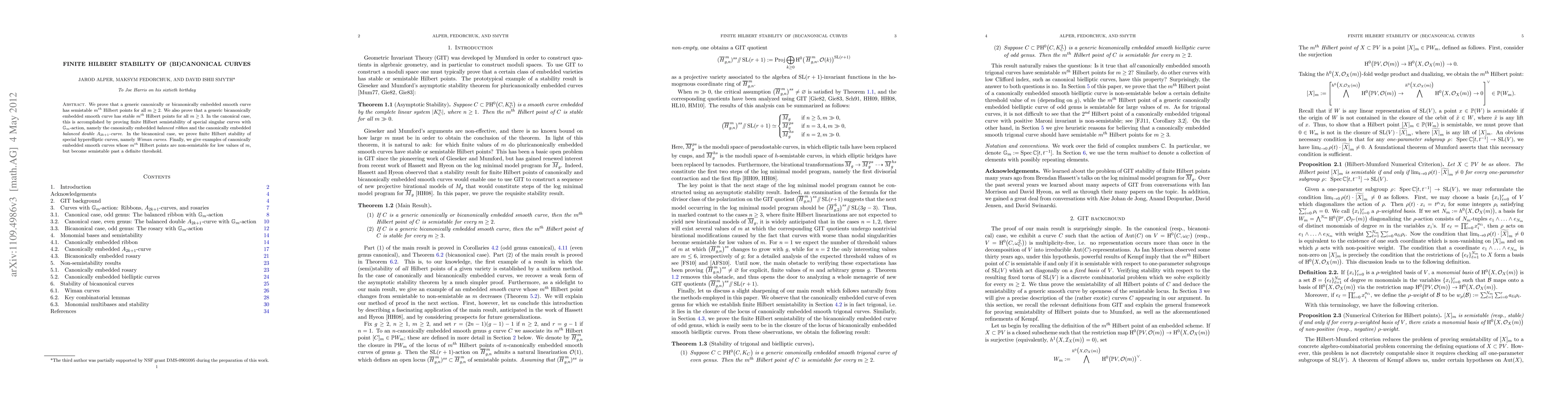 We prove that a generic canonically or bicanonically embedded smooth curve has semistable m-th Hilbert points for all m. We also prove that a generic bicanonically embedded smooth curve has stable m-th Hilbert points for all m \geq 3. In the canonical case, this is accomplished by proving finite Hilbert semistability of special singular curves with G_m-action, namely the canonically embedded balanced ribbon and the canonically embedded balanced double A_{2k+1}-curve. In the bicanonical case, we prove finite Hilbert stability of special hyperelliptic curves, namely Wiman curves. Finally, we give examples of canonically embedded smooth curves whose m-th Hilbert points are non-semistable for low values of m, but become semistable past a definite threshold. (This paper subsumes the previous submission and arXiv:1110.5960).