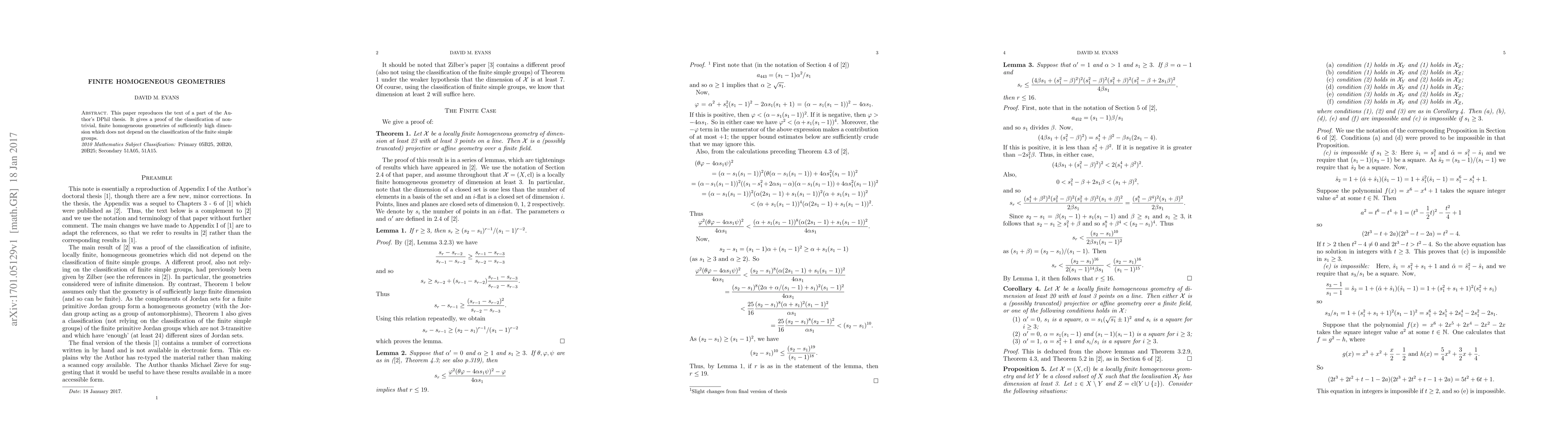 This paper reproduces the text of a part of the Author's DPhil thesis. It gives a proof of the classification of non-trivial, finite homogeneous geometries of sufficiently high dimension which does not depend on the classification of the finite simple groups.