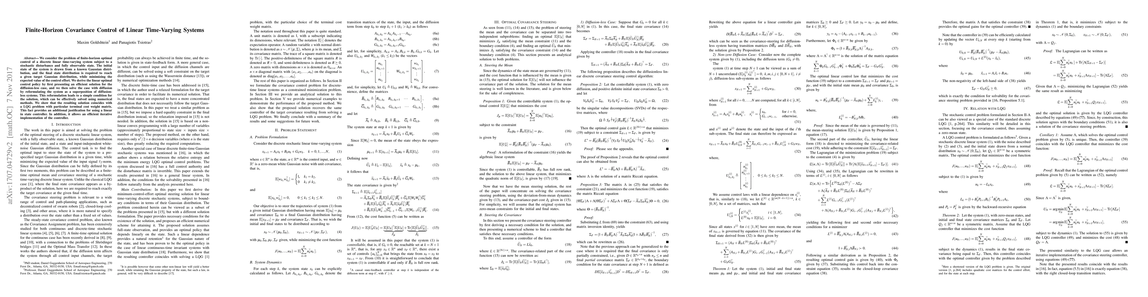 This paper addresses the finite-horizon optimal control of discrete linear time-varying systems under stochastic disturbances, aiming to transition the initial Gaussian state distribution to a target Gaussian distribution while minimizing control effort. The authors derive the optimal linear control policy through reformulation of the system, showing it aligns with a LQG problem and enabling efficient iterative implementation.