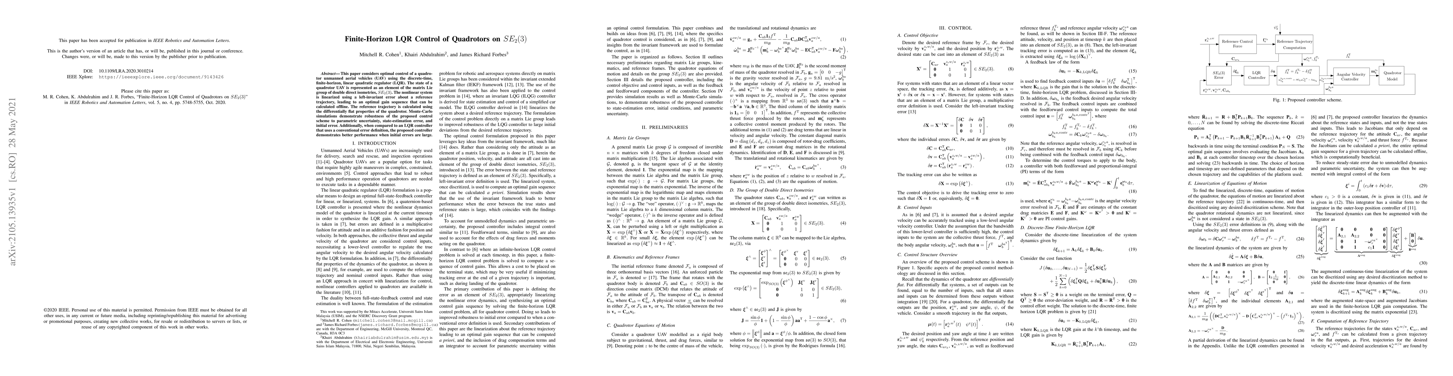 This paper proposes a finite-horizon LQR control scheme for quadrotor UAVs, utilizing $SE_2(3)$ to represent the state and linearizing the system around a reference trajectory. Monte-Carlo simulations show improved performance under large initial errors compared to a conventional LQR controller.
