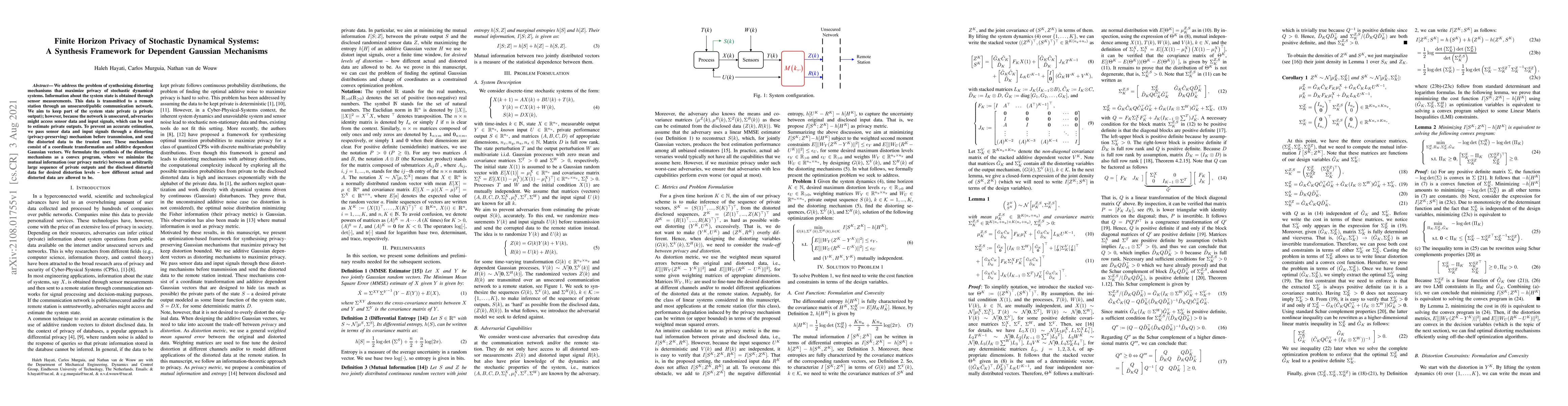 This paper proposes a convex optimization framework for synthesizing privacy-preserving mechanisms for stochastic dynamical systems. The mechanisms aim to distort sensor data and input signals to minimize mutual information, thereby maximizing privacy for private outputs transmitted over an unsecured network.