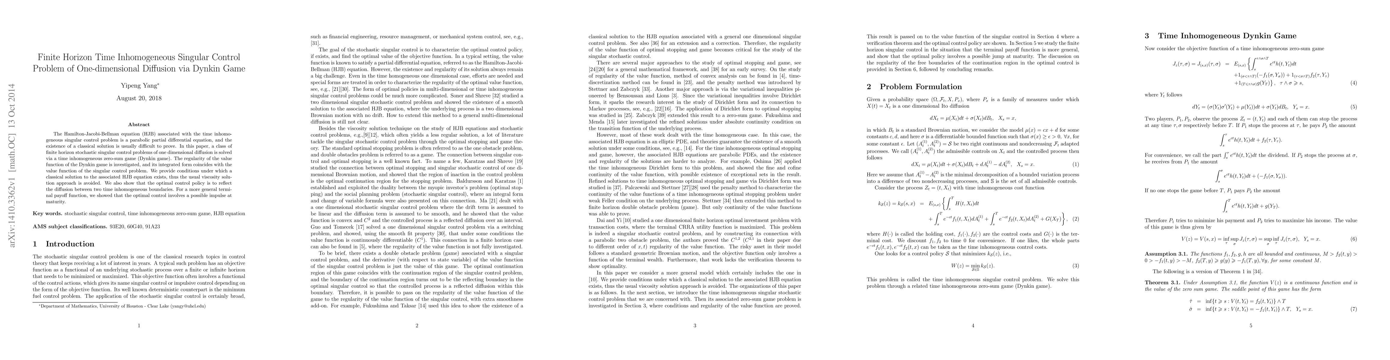 The Hamilton-Jacobi-Bellman equation (HJB) associated with the time inhomogeneous singular control problem is a parabolic partial differential equation, and the existence of a classical solution is usually difficult to prove. In this paper, a class of finite horizon stochastic singular control problems of one dimensional diffusion is solved via a time inhomogeneous zero-sum game (Dynkin game). The regularity of the value function of the Dynkin game is investigated, and its integrated form coincides with the value function of the singular control problem. We provide conditions under which a classical solution to the associated HJB equation exists, thus the usual viscosity solution approach is avoided. We also show that the optimal control policy is to reflect the diffusion between two time inhomogeneous boundaries. For a more general terminal payoff function, we showed that the optimal control involves a possible impulse at maturity.