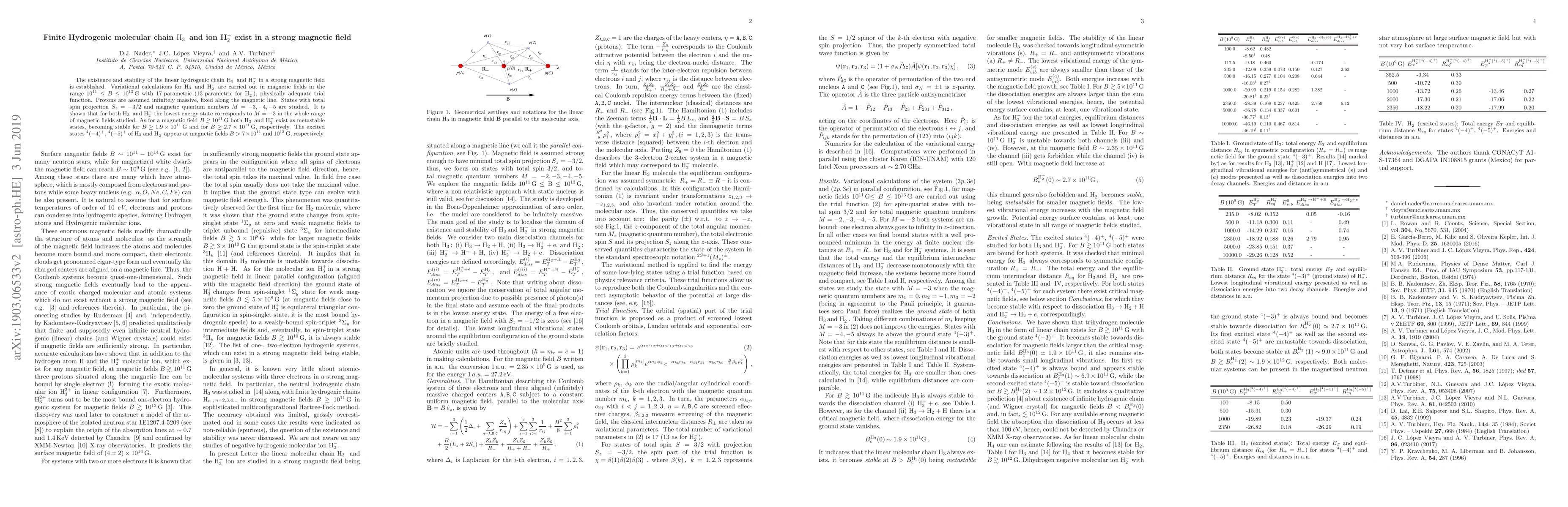 This paper establishes the existence and stability of the linear hydrogenic chains H$_3$ and H$_2^-$ in strong magnetic fields up to $10^{13}$ G. It finds that both species become stable at magnetic fields of $1.9 \times 10^{11}$ G and $2.7 \times 10^{11}$ G, respectively, with the lowest energy state corresponding to $M=-3$ throughout the studied range.