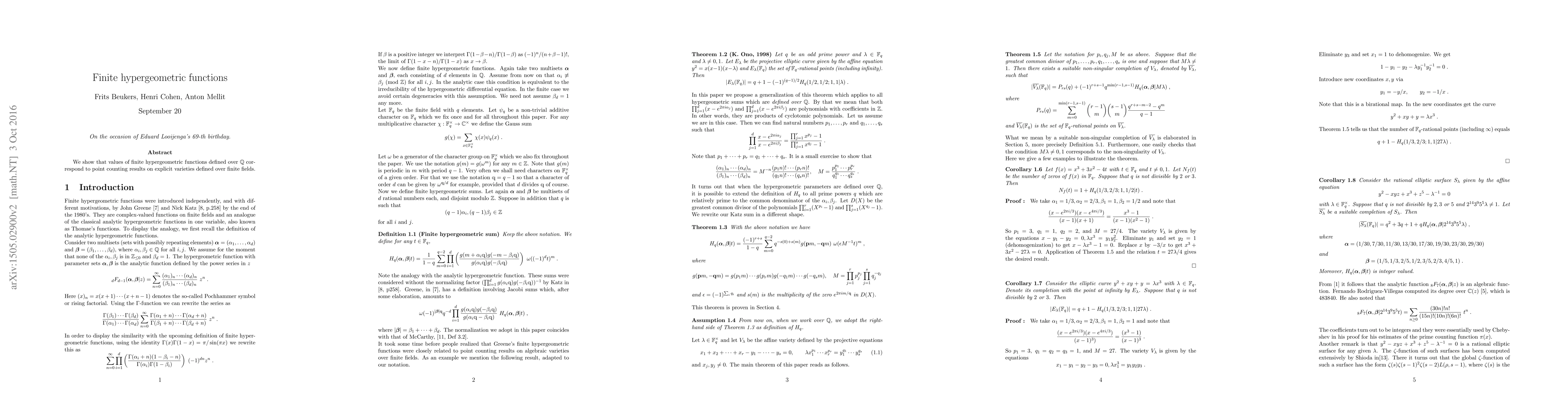 This paper explores finite hypergeometric functions, which are analogues of classical hypergeometric functions on finite fields, and shows their connection to traces of Frobenius on l-adic sheaves. It specifically investigates one-variable functions with rational integer-defined monodromy, providing formulas for point counts on varieties over finite fields.