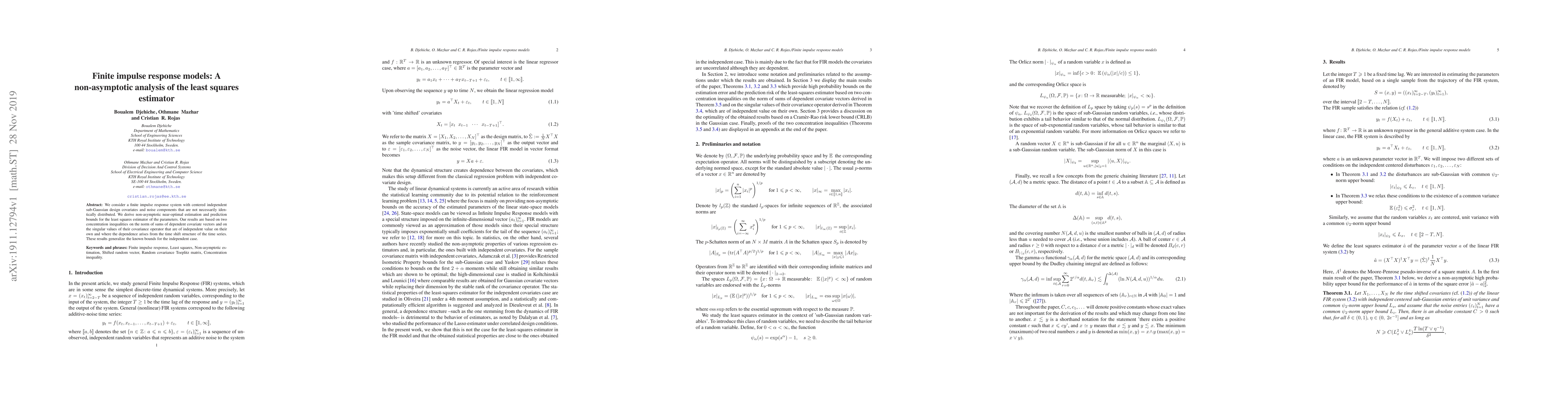 This paper develops non-asymptotic bounds for the least-squares estimator in finite impulse response models with sub-Gaussian covariates and non-identically distributed noise. The results rely on novel concentration inequalities for dependent covariate vectors and their covariance operator, extending known bounds for independent cases.