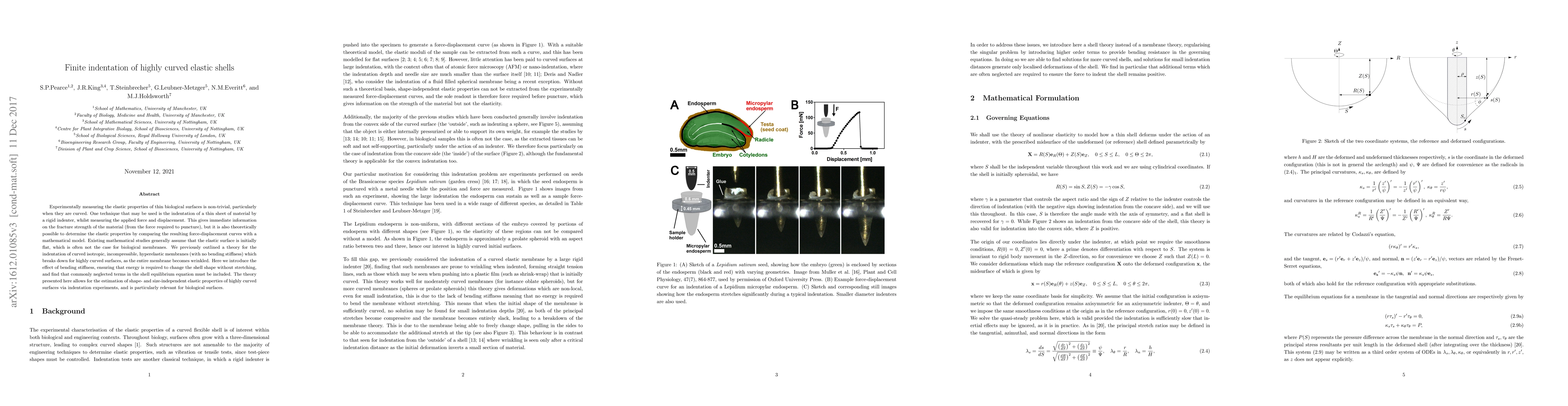 The research presents a mathematical framework for the finite indentation of curved elastic shells, incorporating bending stiffness to regularize membrane equations and enable consideration of curved surfaces, particularly relevant for biological samples.