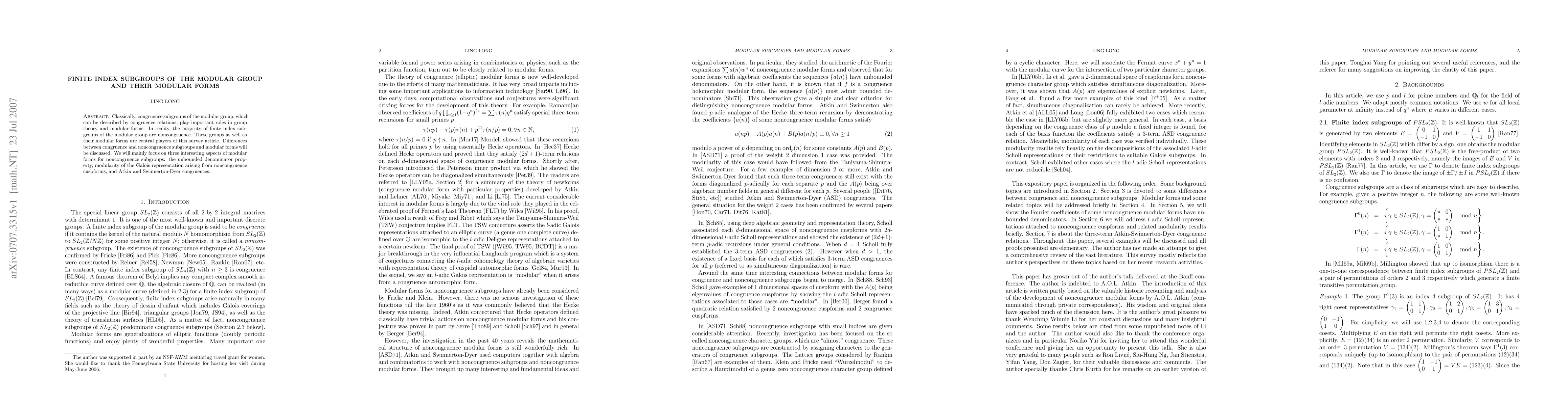 This paper surveys finite index subgroups of the modular group, particularly noncongruence subgroups, and their associated modular forms, highlighting the unbounded denominator property, modularity of Galois representations, and Atkin-Swinnerton-Dyer congruences. It contrasts these aspects with those of congruence subgroups.