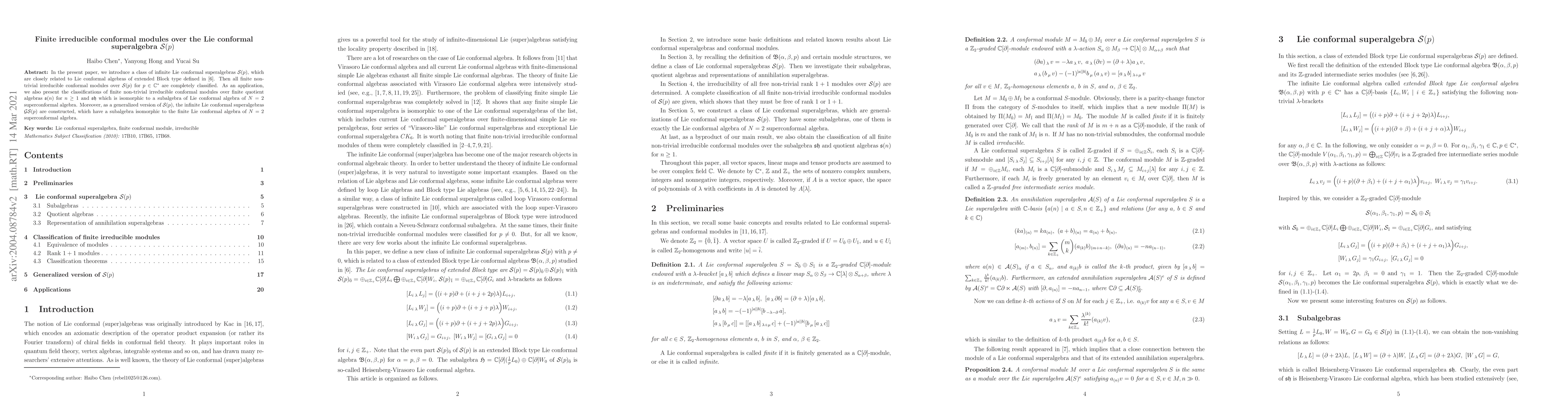 In the present paper, we introduce a class of infinite Lie conformal superalgebras $\mathcal{S}(p)$, which are closely related to Lie conformal algebras of extended Block type defined in \cite{CHS}. Then all finite non-trivial irreducible conformal modules over $\mathcal{S}(p)$ for $p\in\C^*$ are completely classified. As an application, we also present the classifications of finite non-trivial irreducible conformal modules over finite quotient algebras $\mathfrak{s}(n)$ for $n\geq1$ and $\mathfrak{sh}$ which is isomorphic to a subalgebra of Lie conformal algebra of $N=2$ superconformal algebra. Moreover, as a generalized version of $\mathcal{S}(p)$, the infinite Lie conformal superalgebras $\mathcal{GS}(p)$ are constructed, which have a subalgebra isomorphic to the finite Lie conformal algebra of $N=2$ superconformal algebra.