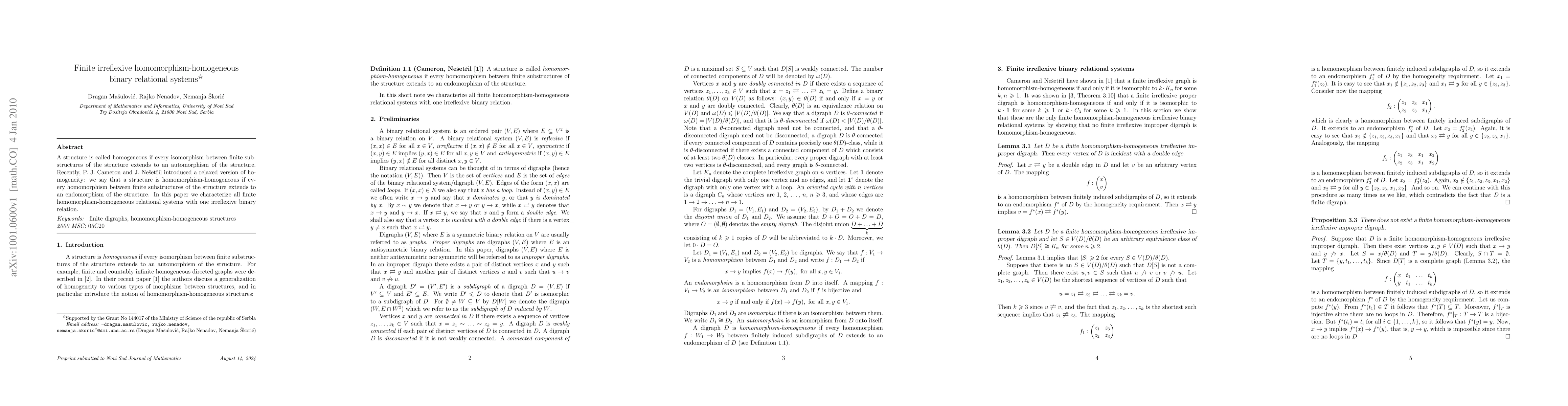A structure is called homogeneous if every isomorphism between finite substructures of the structure extends to an automorphism of the structure. Recently, P. J. Cameron and J. Ne\v{s}et\v{r}il introduced a relaxed version of homogeneity: we say that a structure is homomorphism-homogeneous if every homomorphism between finite substructures of the structure extends to an endomorphism of the structure. In this paper we characterize all finite homomorphism-homogeneous relational systems with one irreflexive binary relation.