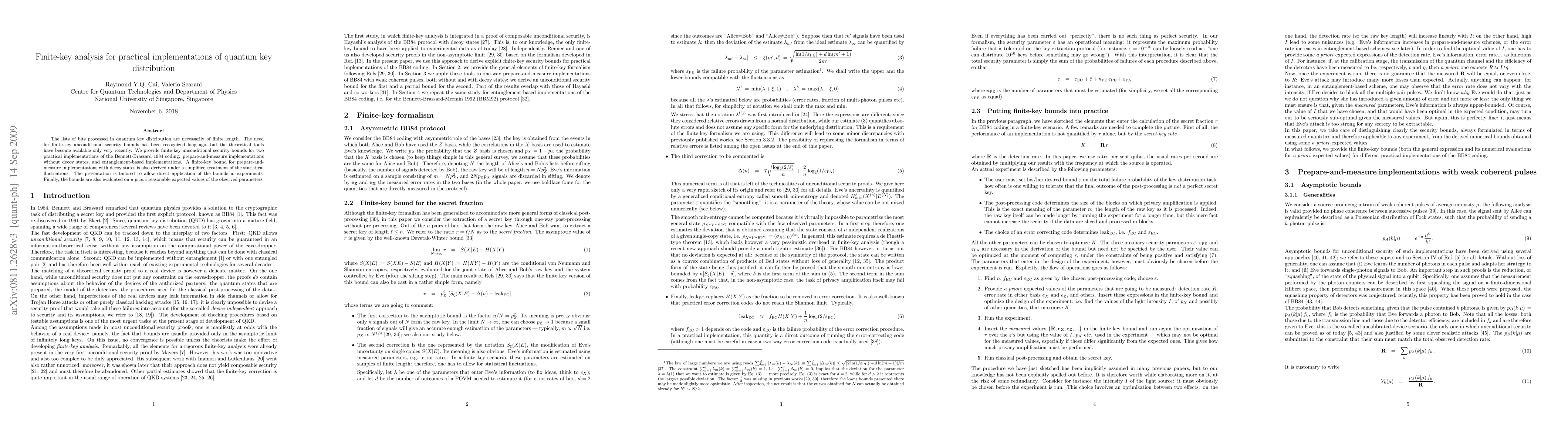 The lists of bits processed in quantum key distribution are necessarily of finite length. The need for finite-key unconditional security bounds has been recognized long ago, but the theoretical tools have become available only very recently. We provide finite-key unconditional security bounds for two practical implementations of the Bennett-Brassard 1984 coding: prepare-and-measure implementations without decoy states, and entanglement-based implementations. A finite-key bound for prepare-and-measure implementations with decoy states is also derived under a simplified treatment of the statistical fluctuations. The presentation is tailored to allow direct application of the bounds in experiments. Finally, the bounds are also evaluated on a priori reasonable expected values of the observed parameters.