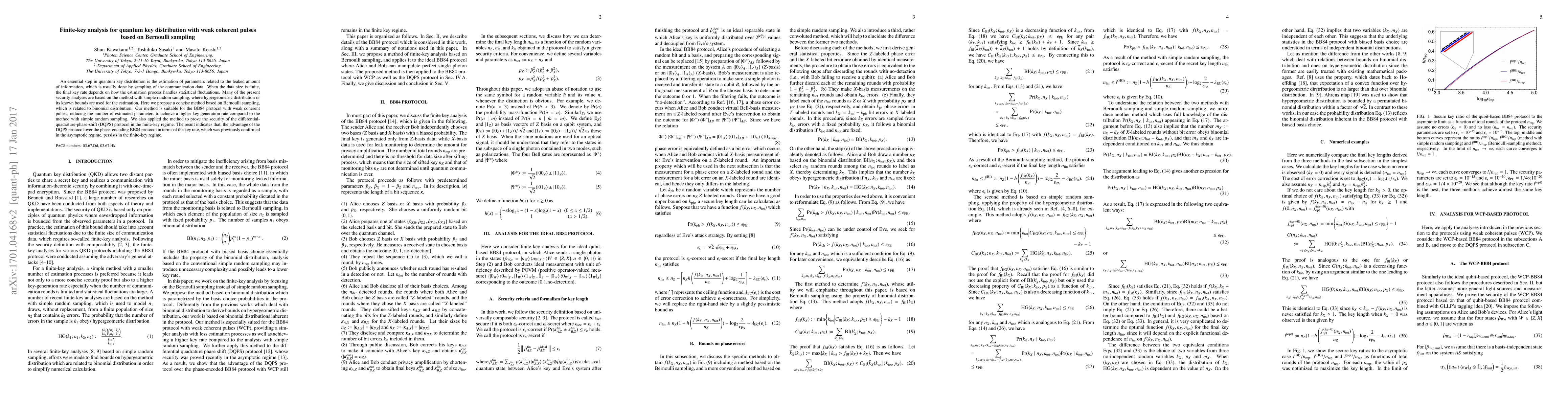 This paper proposes a Bernoulli sampling method for finite-key analysis in quantum key distribution using weak coherent pulses, achieving a higher key generation rate compared to simple random sampling. The method also proves the security of the DQPS protocol in the finite-key regime, confirming its advantage over the BB84 protocol.