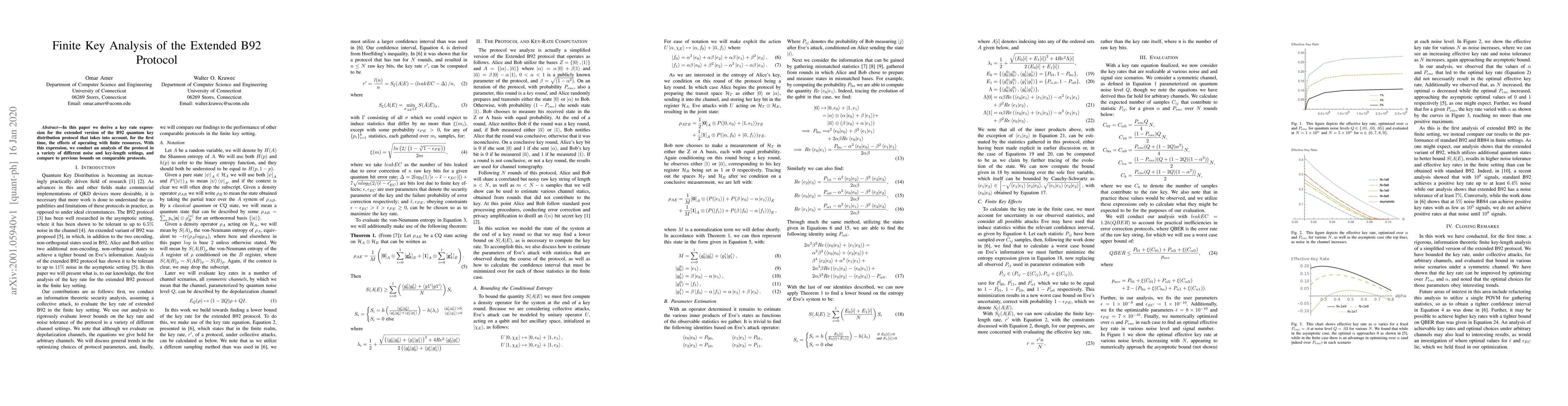 This paper derives a key rate expression for the extended B92 quantum key distribution protocol, considering finite operational resources for the first time. It analyzes the protocol under various noise and key-length conditions, comparing results to previous protocol bounds.