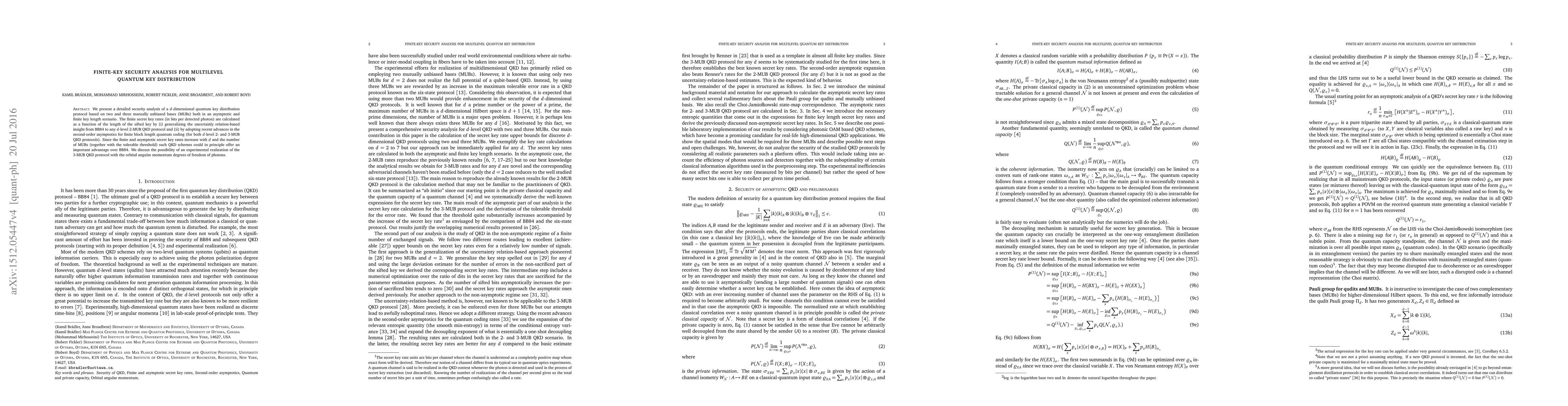 The paper presents a detailed security analysis of a d-dimensional quantum key distribution protocol based on two and three mutually unbiased bases (MUBs), considering both asymptotic and finite key length scenarios. It generalizes BB84's uncertainty relation insight for d-level 2-MUB QKD and adopts recent advances in second-order asymptotics for finite block length quantum coding.