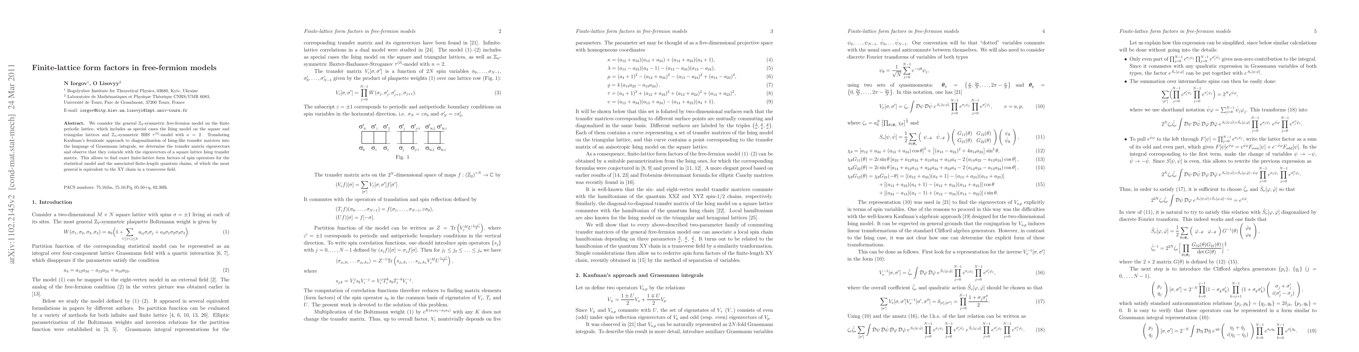 We consider the general $\mathbb{Z}_2$-symmetric free-fermion model on the finite periodic lattice, which includes as special cases the Ising model on the square and triangular lattices and $\mathbb{Z}_n$-symmetric BBS $\tau^{(2)}$-model with $n=2$. Translating Kaufman's fermionic approach to diagonalization of Ising-like transfer matrices into the language of Grassmann integrals, we determine the transfer matrix eigenvectors and observe that they coincide with the eigenvectors of a square lattice Ising transfer matrix. This allows to find exact finite-lattice form factors of spin operators for the statistical model and the associated finite-length quantum chains, of which the most general is equivalent to the XY chain in a transverse field.