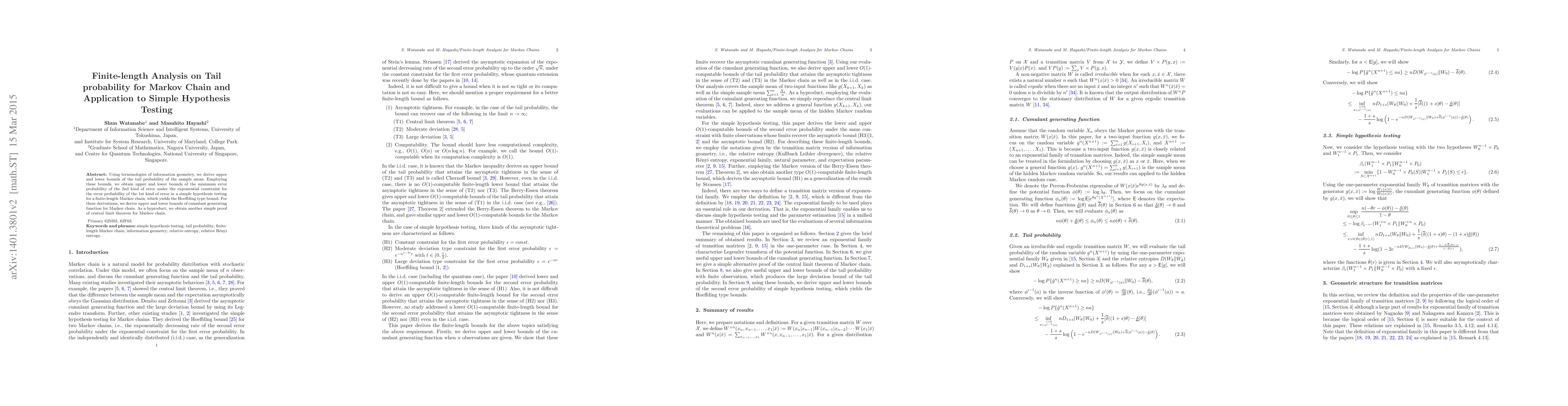 Using terminologies of information geometry, we derive upper and lower bounds of the tail probability of the sample mean. Employing these bounds, we obtain upper and lower bounds of the minimum error probability of the 2nd kind of error under the exponential constraint for the error probability of the 1st kind of error in a simple hypothesis testing for a finite-length Markov chain, which yields the Hoeffding type bound. For these derivations, we derive upper and lower bounds of cumulant generating function for Markov chain. As a byproduct, we obtain another simple proof of central limit theorem for Markov chain.
