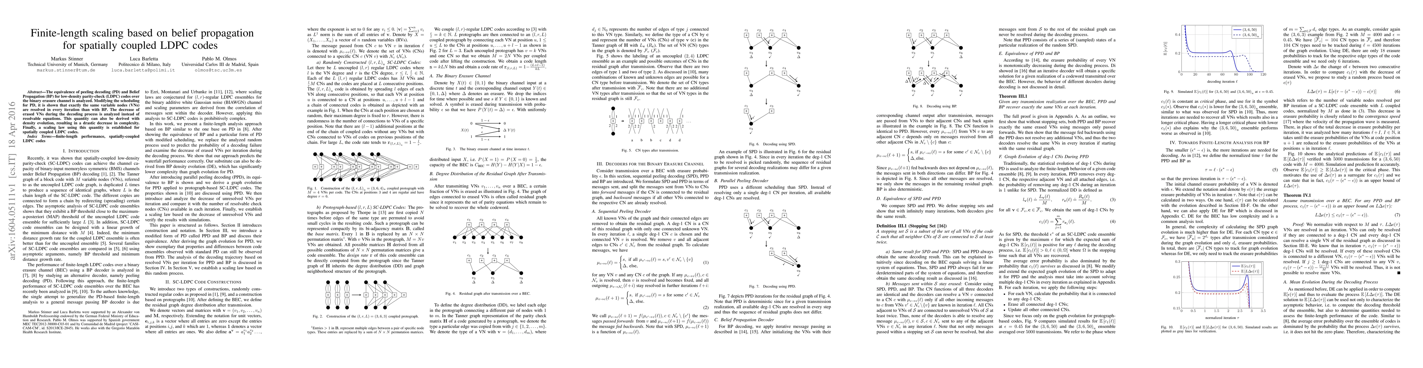 The equivalence of peeling decoding (PD) and Belief Propagation (BP) for low-density parity-check (LDPC) codes over the binary erasure channel is analyzed. Modifying the scheduling for PD, it is shown that exactly the same variable nodes (VNs) are resolved in every iteration than with BP. The decrease of erased VNs during the decoding process is analyzed instead of resolvable equations. This quantity can also be derived with density evolution, resulting in a drastic decrease in complexity. Finally, a scaling law using this quantity is established for spatially coupled LDPC codes.