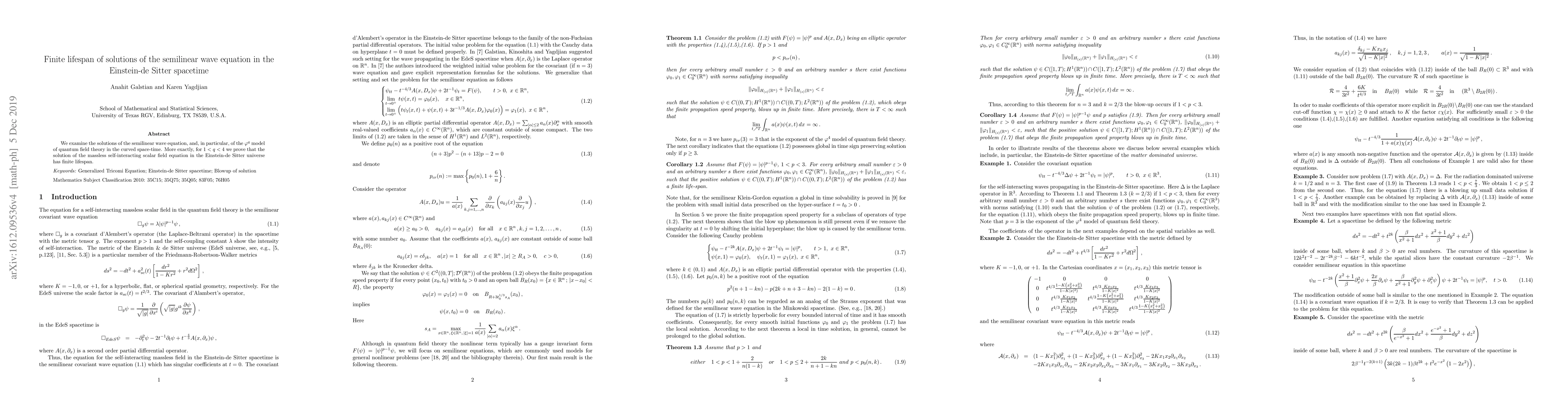 We examine the solutions of the semilinear wave equation, and, in particular, of the $\varphi ^p$ model of quantum field theory in the curved space-time. More exactly, for $1< p<4$ we prove that solution of the massless self-interacting scalar field equation in the Einstein-de Sitter universe has finite lifespan.