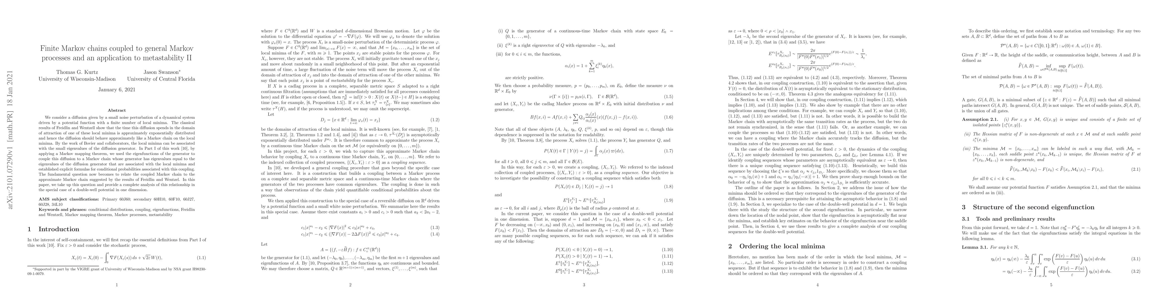 We consider a diffusion given by a small noise perturbation of a dynamical system driven by a potential function with a finite number of local minima. The classical results of Freidlin and Wentzell show that the time this diffusion spends in the domain of attraction of one of these local minima is approximately exponentially distributed and hence the diffusion should behave approximately like a Markov chain on the local minima. By the work of Bovier and collaborators, the local minima can be associated with the small eigenvalues of the diffusion generator. In Part I of this work, by applying a Markov mapping theorem, we used the eigenfunctions of the generator to couple this diffusion to a Markov chain whose generator has eigenvalues equal to the eigenvalues of the diffusion generator that are associated with the local minima and established explicit formulas for conditional probabilities associated with this coupling. The fundamental question now becomes to relate the coupled Markov chain to the approximate Markov chain suggested by the results of Freidlin and Wentzel. In this paper, we take up this question and provide a complete analysis of this relationship in the special case of a double-well potential in one dimension.