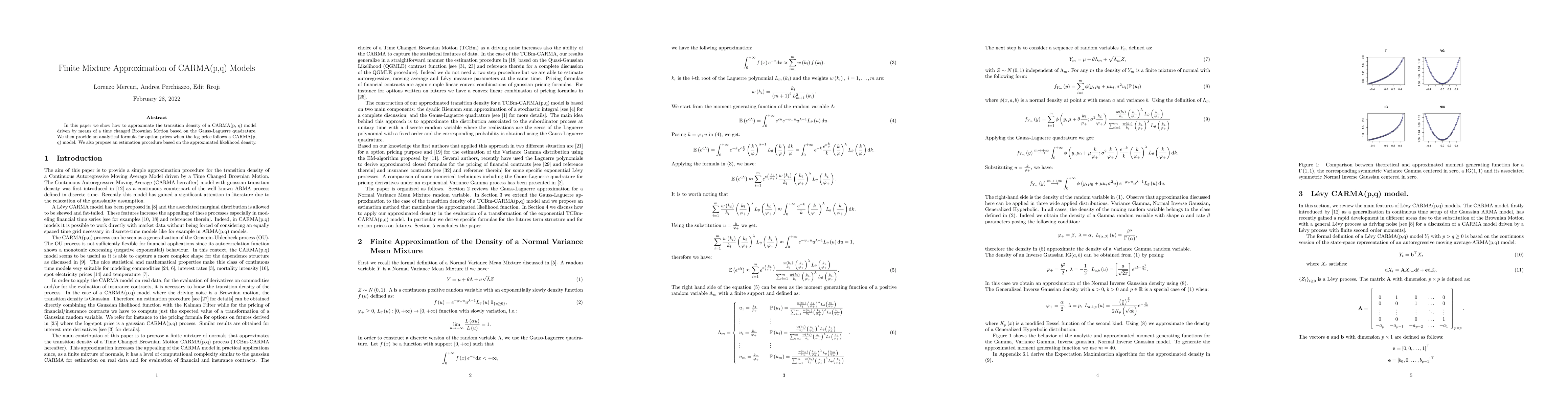 In this paper we show how to approximate the transition density of a CARMA(p, q) model driven by means of a time changed Brownian Motion based on the Gauss-Laguerre quadrature. We then provide an analytical formula for option prices when the log price follows a CARMA(p, q) model. We also propose an estimation procedure based on the approximated likelihood density.