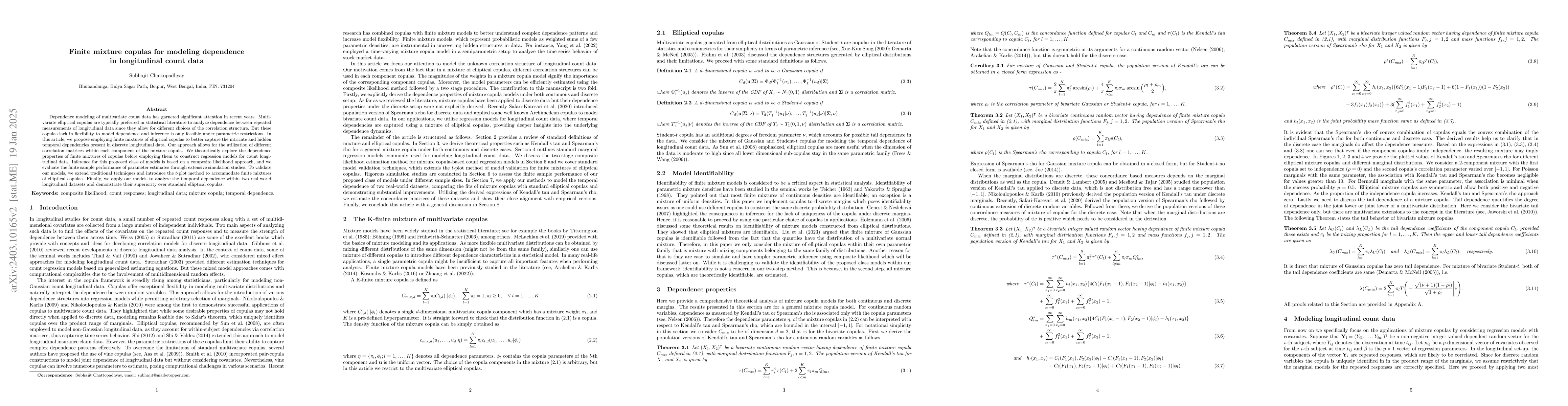 This paper proposes finite mixture copulas to model complex temporal dependencies in longitudinal count data, overcoming the limitations of standard elliptical copulas. The approach allows for different correlation structures and is validated through simulations and real-world data analysis, demonstrating improved performance over traditional methods.