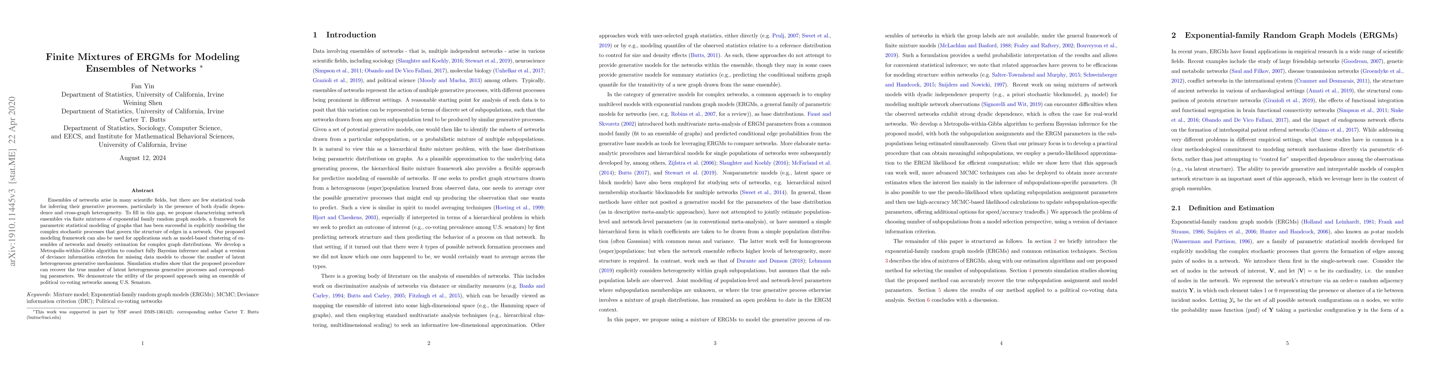 This paper proposes a finite mixture of exponential family random graph models (ERGMs) to model ensembles of networks, addressing both dyadic dependence and cross-graph heterogeneity. The authors develop a Bayesian inference method and demonstrate its effectiveness through simulations and an application to political co-voting networks.
