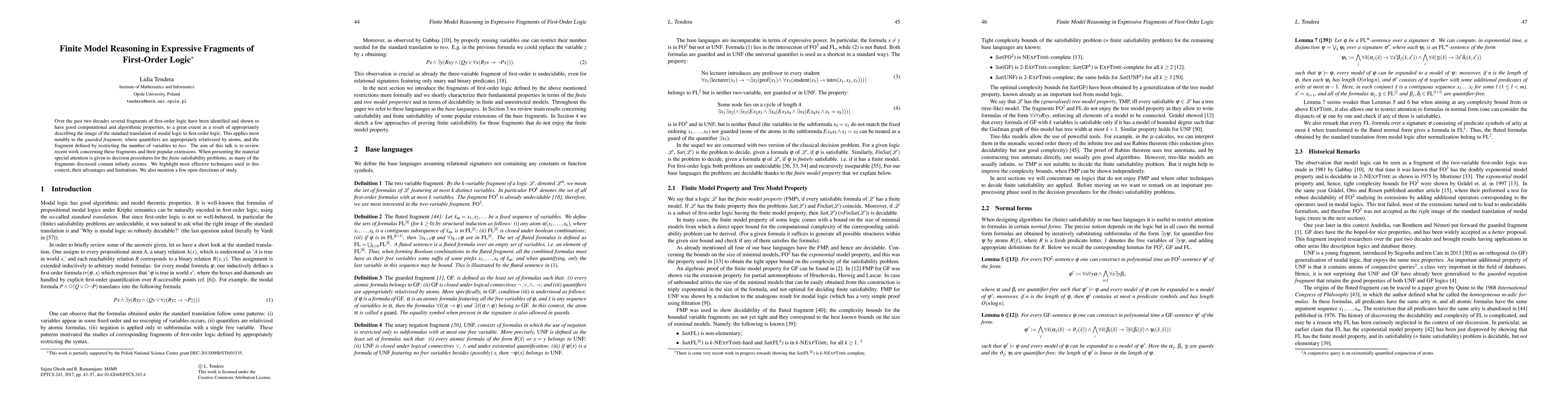 This paper reviews recent advancements in computational properties of expressive fragments of first-order logic, particularly the guarded fragment and two-variable fragment, focusing on decision procedures for finite satisfiability problems and highlighting effective techniques along with their advantages and limitations. It also outlines potential future research directions.