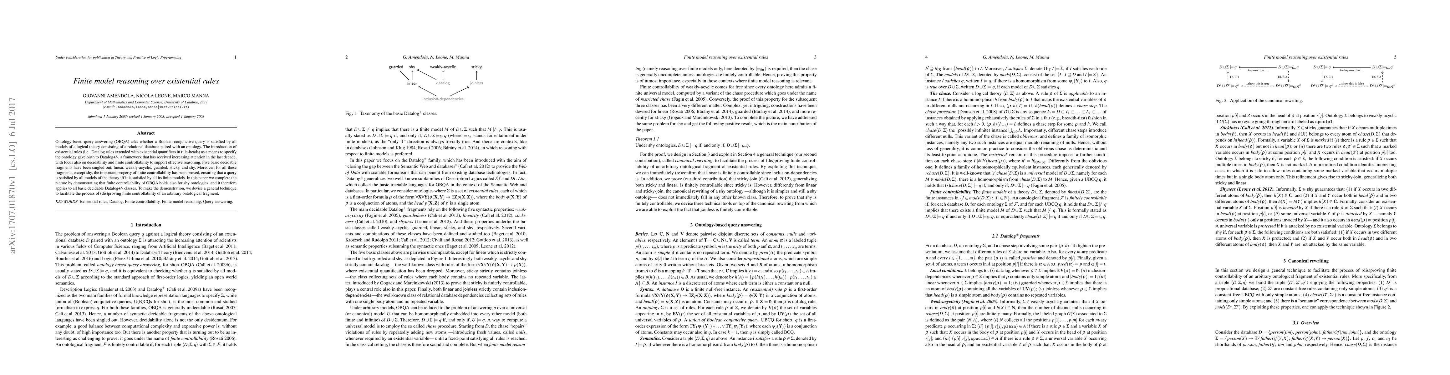 Ontology-based query answering (OBQA) asks whether a Boolean conjunctive query is satisfied by all models of a logical theory consisting of a relational database paired with an ontology. The introduction of existential rules (i.e., Datalog rules extended with existential quantifiers in rule-heads) as a means to specify the ontology gave birth to Datalog+/-, a framework that has received increasing attention in the last decade, with focus also on decidability and finite controllability to support effective reasoning. Five basic decidable fragments have been singled out: linear, weakly-acyclic, guarded, sticky, and shy. Moreover, for all these fragments, except shy, the important property of finite controllability has been proved, ensuring that a query is satisfied by all models of the theory iff it is satisfied by all its finite models. In this paper we complete the picture by demonstrating that finite controllability of OBQA holds also for shy ontologies, and it therefore applies to all basic decidable Datalog+/- classes. To make the demonstration, we devise a general technique to facilitate the process of (dis)proving finite controllability of an arbitrary ontological fragment. This paper is under consideration for acceptance in TPLP.